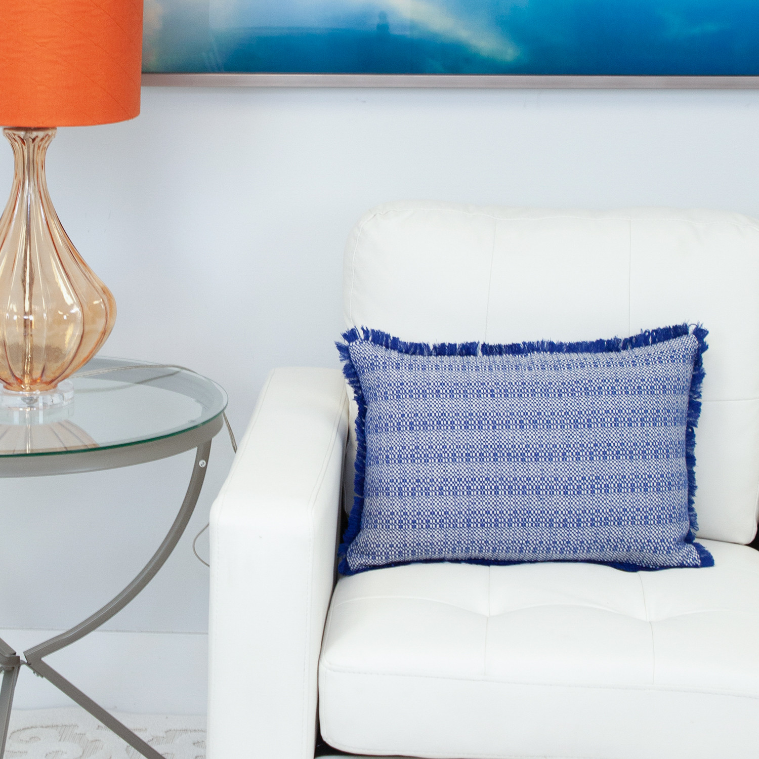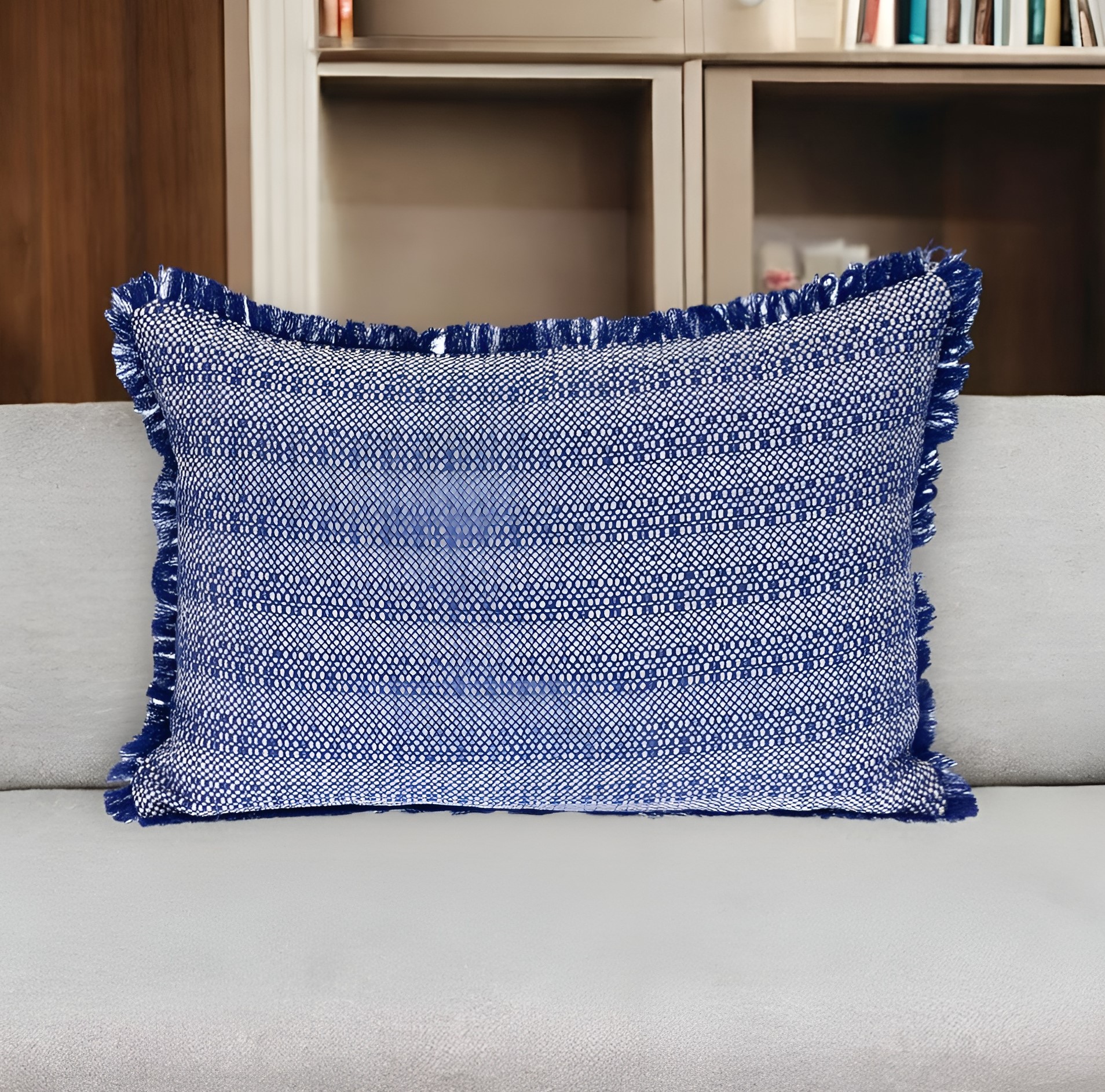 blue white cotton pillow fringe, white cotton pillow fringe, white cotton pillow fringe edges, cotton pillow fringe, 14" X 20" blue white cotton pillow |