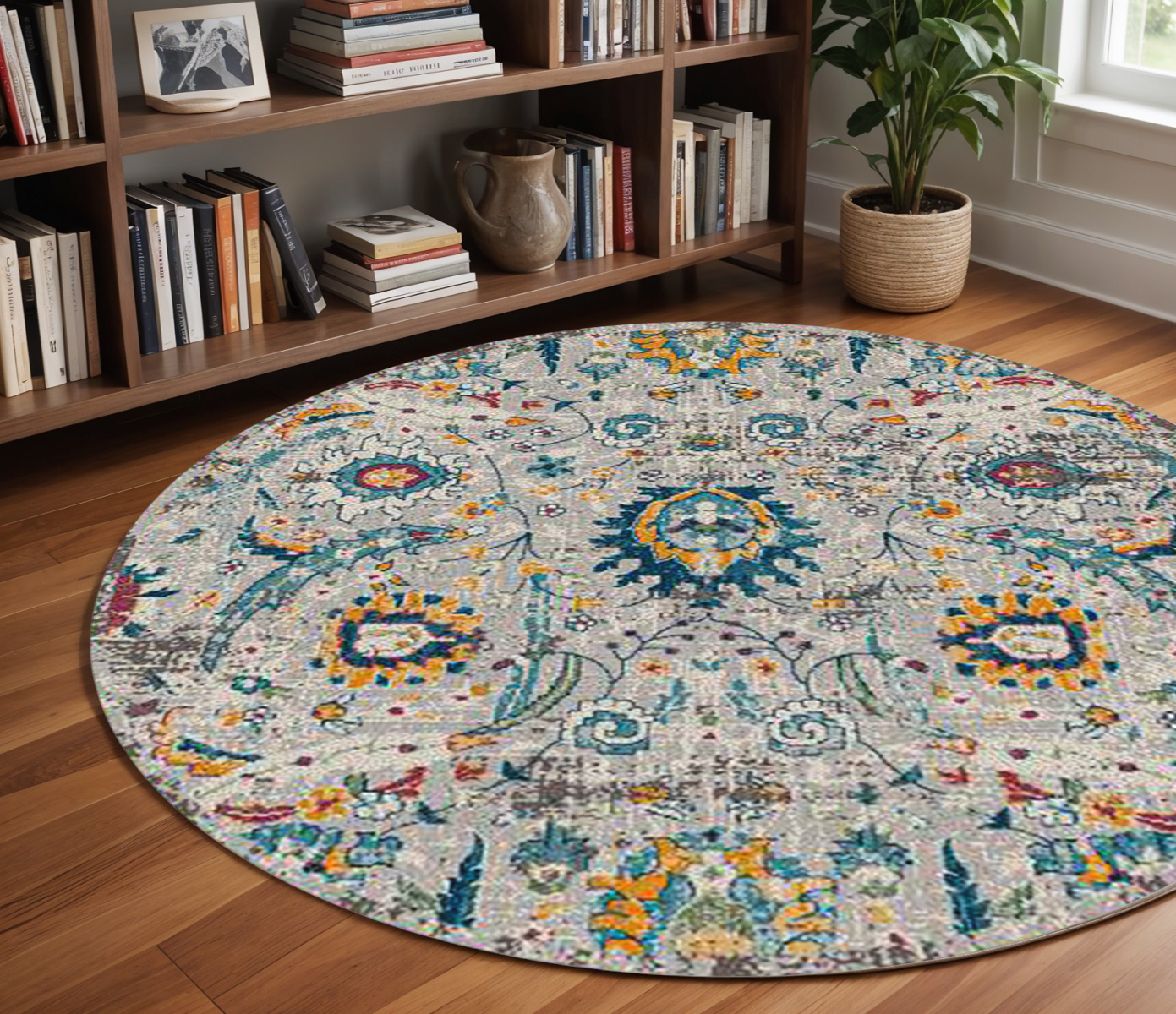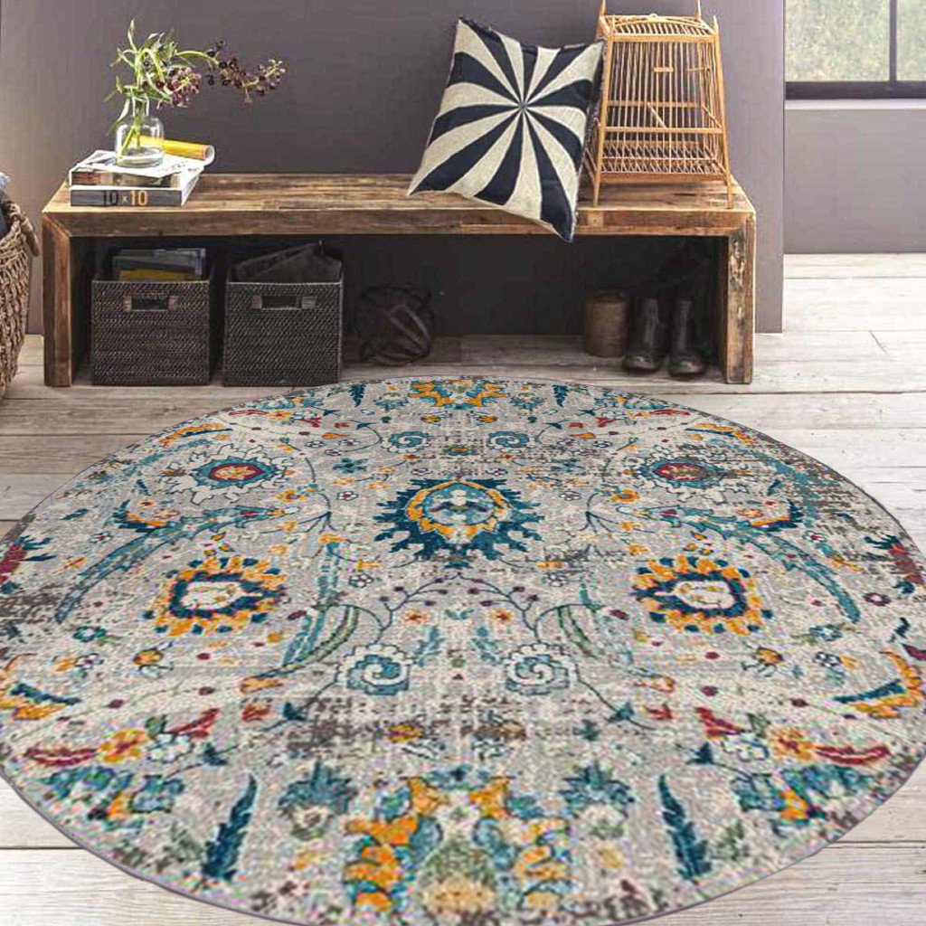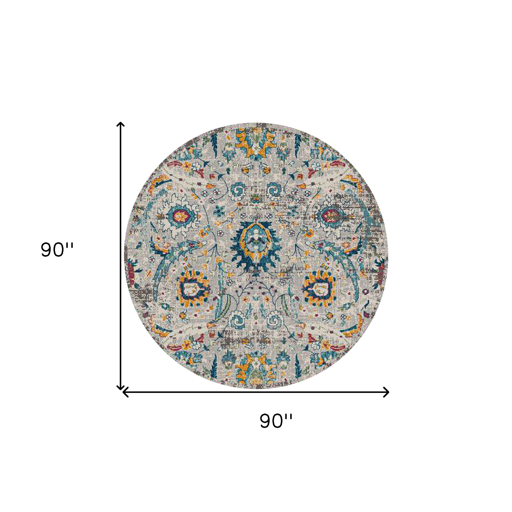 Add some artistry to your room with this 8-foot x 8-foot gray blue and orange area rug. Ideal for spaces with kids and pets, this rug is stain resistant to help repel dirt and spilled liquids. Built to last, this rug crafted from polypropylene fibers is known for its durability and long lasting appeal. Rugs are a great way to showcase your style, hide imperfections, warm your home and reduce noise. This larger sized, transitional styled rug is ready to create a focal point or statement piece in your room. 90.00-inch h x 90.00-inch w x 0.38-inch d.