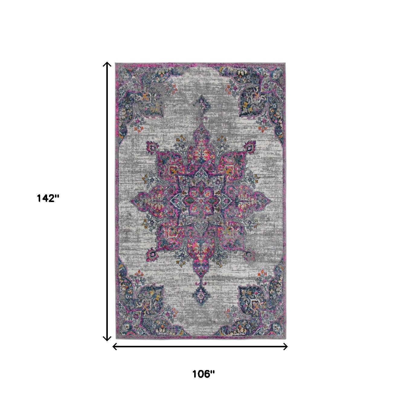 Add some artistry to your room with this 9-foot x 12-foot pink gray and blue area rug. Ideal for spaces with kids and pets, this rug is stain resistant to help repel dirt and spilled liquids. Built to last, this rug crafted from polypropylene fibers is known for its durability and long lasting appeal. Rugs are a great way to showcase your style, hide imperfections, warm your home and reduce noise. This larger sized, transitional styled rug is ready to create a focal point or statement piece in your room. 106.00-inch h x 142.00-inch w x 0.38-inch d.