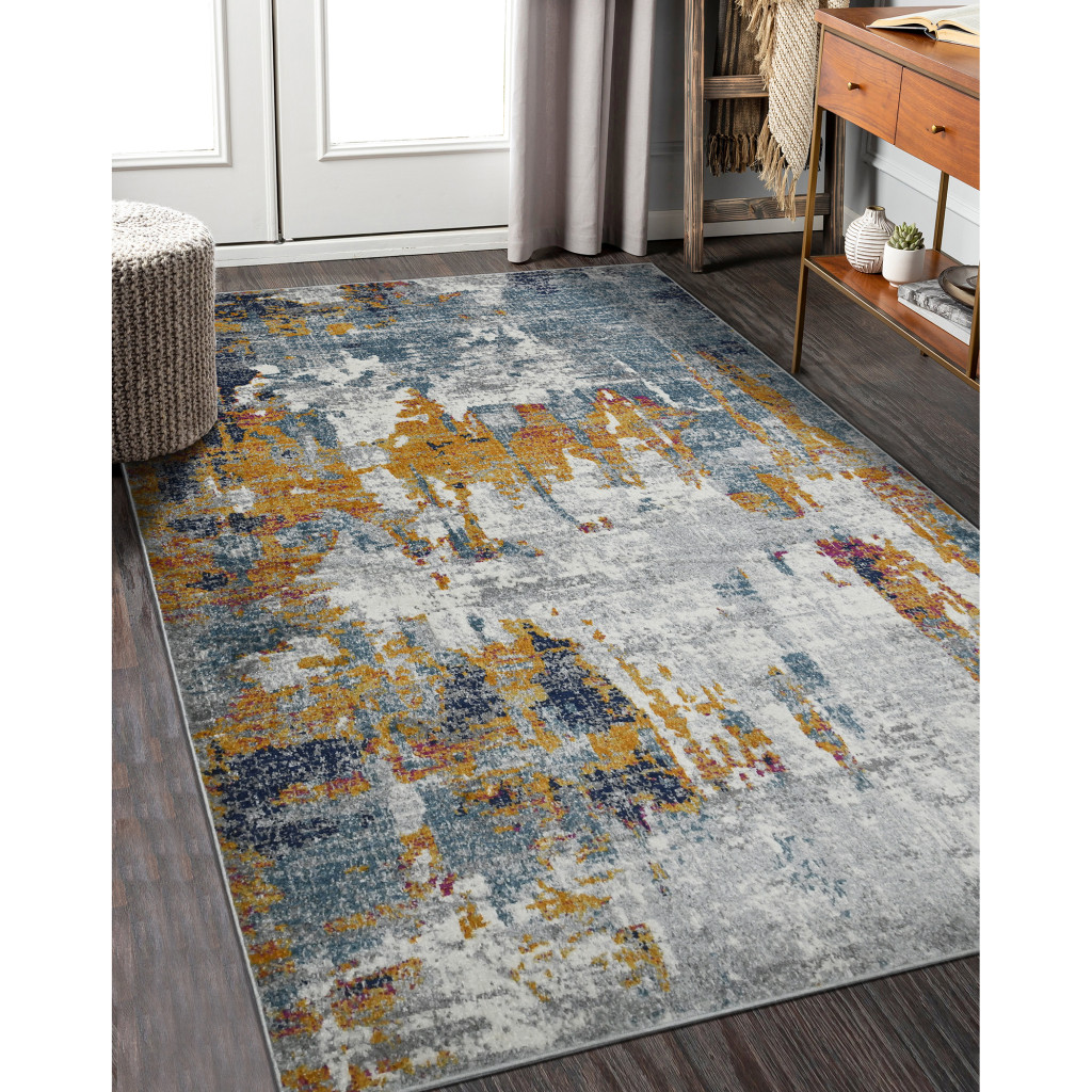 Set an inviting tone in your space with this 5-foot x 7-foot blue orange and gray area rug. Ideal for spaces with kids and pets, this rug is stain resistant to help repel dirt and spilled liquids. Built to last, this rug crafted from polypropylene fibers is known for its durability and long lasting appeal. Rugs are a great way to showcase your style, hide imperfections, warm your home and reduce noise. This larger sized, transitional styled rug is ready to create a focal point or statement piece in your room. 63.00-inch h x 90.00-inch w x 0.38-inch d.