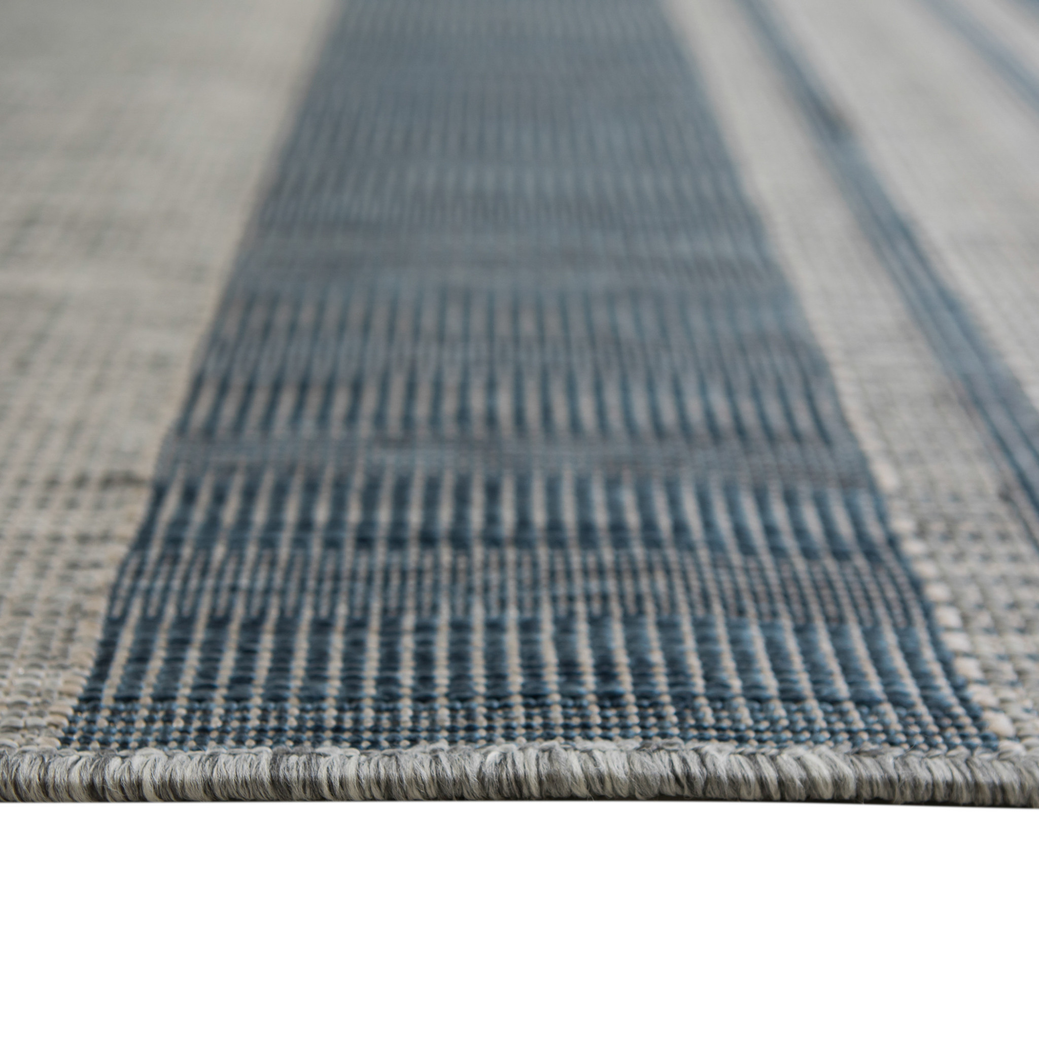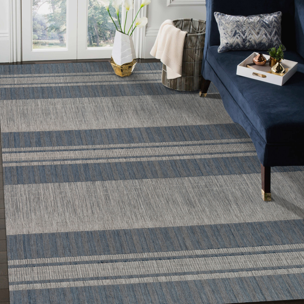 Add great coloration and comfortable texture to your space with this 6-foot x 9-foot blue and gray striped stain resistant indoor outdoor area rug. This rectangle shaped rug features a striped design in blue and gray to give it visual interest. A classic shape marries with good looking design for your space ideal for spaces with kids and pets, this rug is stain resistant to help repel stains and spilled liquids. Area rugs help to give warmth and sense of home to your space. 78-inch H x 118-inch W x 0.02-inch D