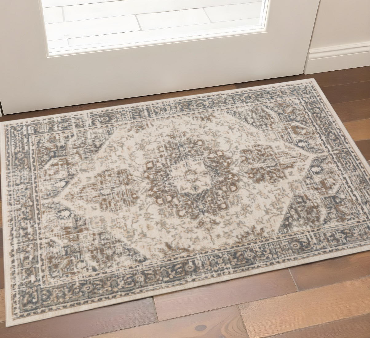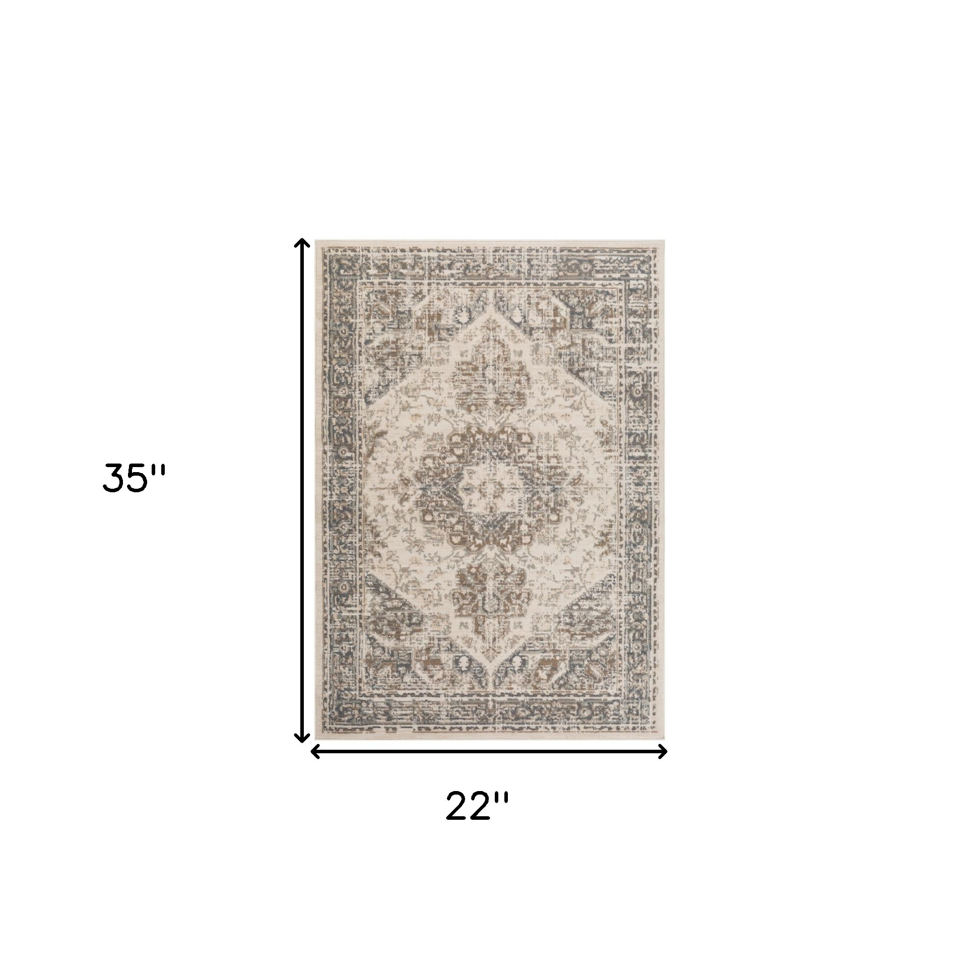 Set an inviting tone in your space with this 2-foot x 3-foot gray and beige medallion area rug. Ideal for spaces with kids and pets, this rug is stain resistant to help repel dirt and spilled liquids. Built to last, this rug crafted from polypropylene fibers is known for its durability and long lasting appeal. Rugs are a great way to showcase your style, hide imperfections, warm your home and reduce noise. This smaller sized, traditional styled rug is just what you need for your walkway, bedside, in front of door, cabinet, refrigerator, or chair. 22.00-inch h x 35.00-inch w x 0.32-inch d.