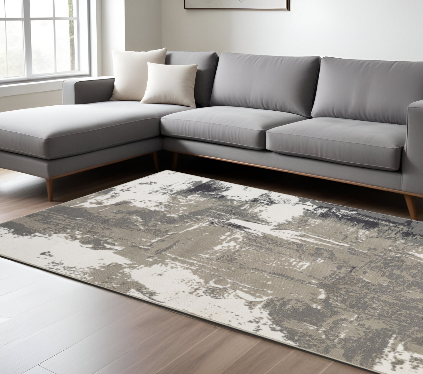 Add great coloration and comfortable texture to your space with this 8-foot x 10-foot ivory black and gray abstract power loom area rug. This rectangle shaped rug features a abstract design in ivory black and gray to give it visual interest. A classic shape marries with good looking design for your space ideal for spaces with kids and pets, this rug is stain resistant to help repel stains and spilled liquids. Area rugs help to give warmth and sense of home to your space. 94-inch H x 122-inch W x 0.32-inch D