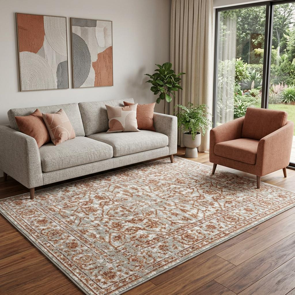 This 8-foot rust and gray floral power loom round rug, is a great way to add warmth to a room. This geometric round shaped rug features a floral pattern in rust and gray that combines a good looking print with a unique and updated shape. The mix of shape, color, and design gives this rug refreshing visual interest. Ideal for spaces with kids and pets, this rug is stain resistant to help repel stains and spilled liquids. Place this area rug against a hardwood or tile floor and it will enliven your living space with style and sophistication. 94-inch H x 94-inch W x 0.32-inch D