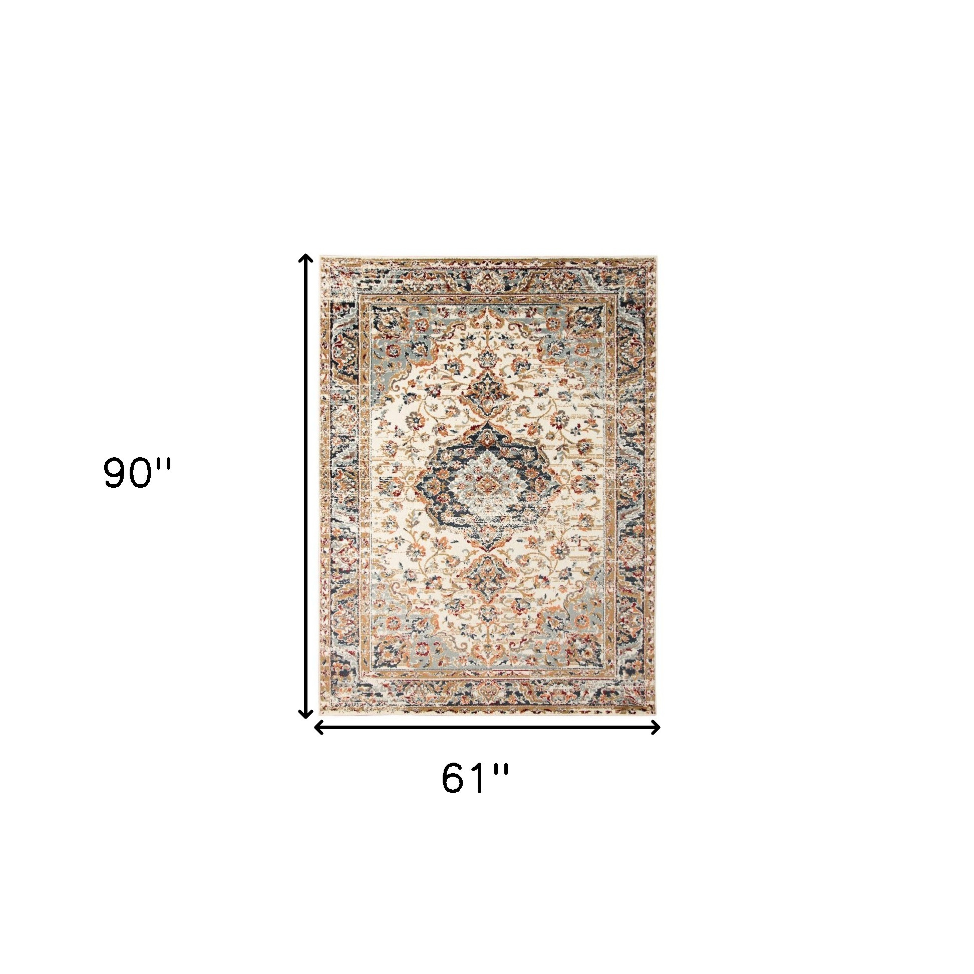 Add some artistry to your room with this 5-foot x 8-foot ivory navy and orange medallion power loom area rug. This rectangle shaped rug features a medallion design in ivory navy and orange to give it visual interest. A classic shape marries with good looking design for your space ideal for spaces with kids and pets, this rug is stain resistant to help repel stains and spilled liquids. Place this area rug against a hardwood or tile floor and it will enliven your living space with style and sophistication. 61-inch H x 90-inch W x 0.38-inch D