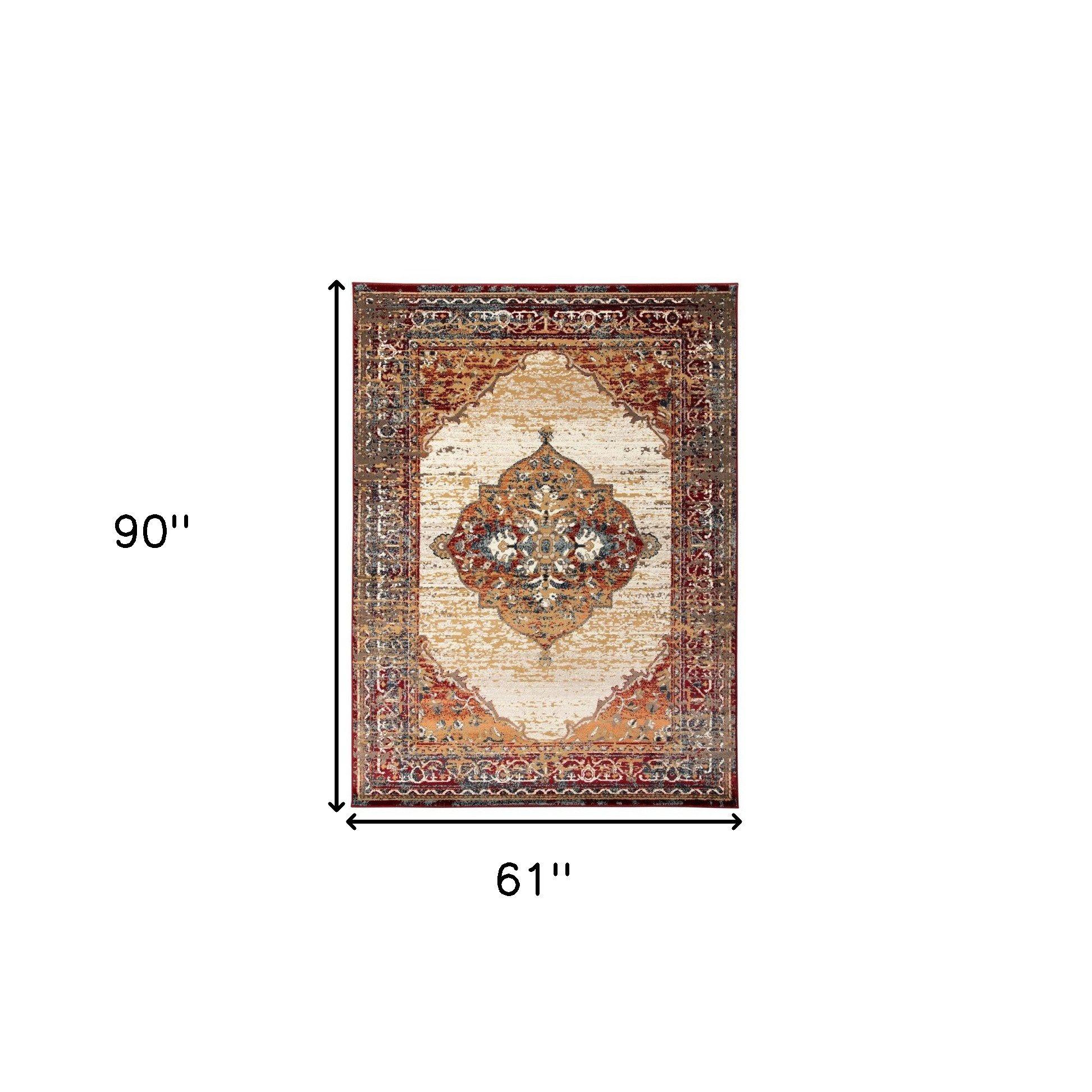 Add great coloration and comfortable texture to your space with this 5-foot x 8-foot ivory red and orange medallion power loom area rug. This rectangle shaped rug features a medallion design in ivory red and orange to give it visual interest. A classic shape marries with good looking design for your space ideal for spaces with kids and pets, this rug is stain resistant to help repel stains and spilled liquids. Place this area rug against a hardwood or tile floor and it will enliven your living space with style and sophistication. 61-inch H x 90-inch W x 0.38-inch D