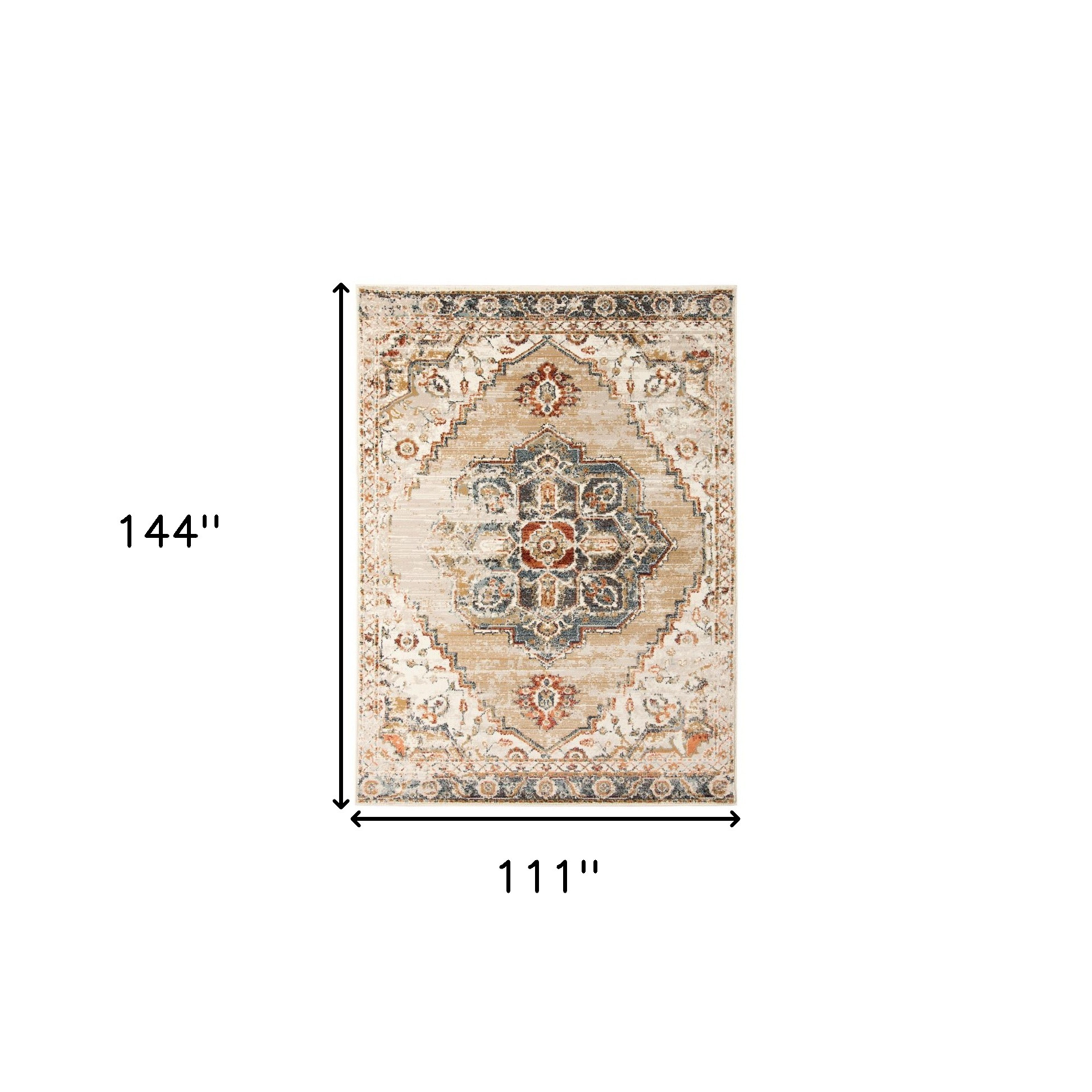 Add great coloration and comfortable texture to your space with this 9-foot x 12-foot ivory tan and gold medallion power loom area rug. This rectangle shaped rug features a medallion design in ivory tan and gold to give it visual interest. A classic shape marries with good looking design for your space ideal for spaces with kids and pets, this rug is stain resistant to help repel stains and spilled liquids. Place this area rug against a hardwood or tile floor and it will enliven your living space with style and sophistication. 111-inch H x 144-inch W x 0.38-inch D