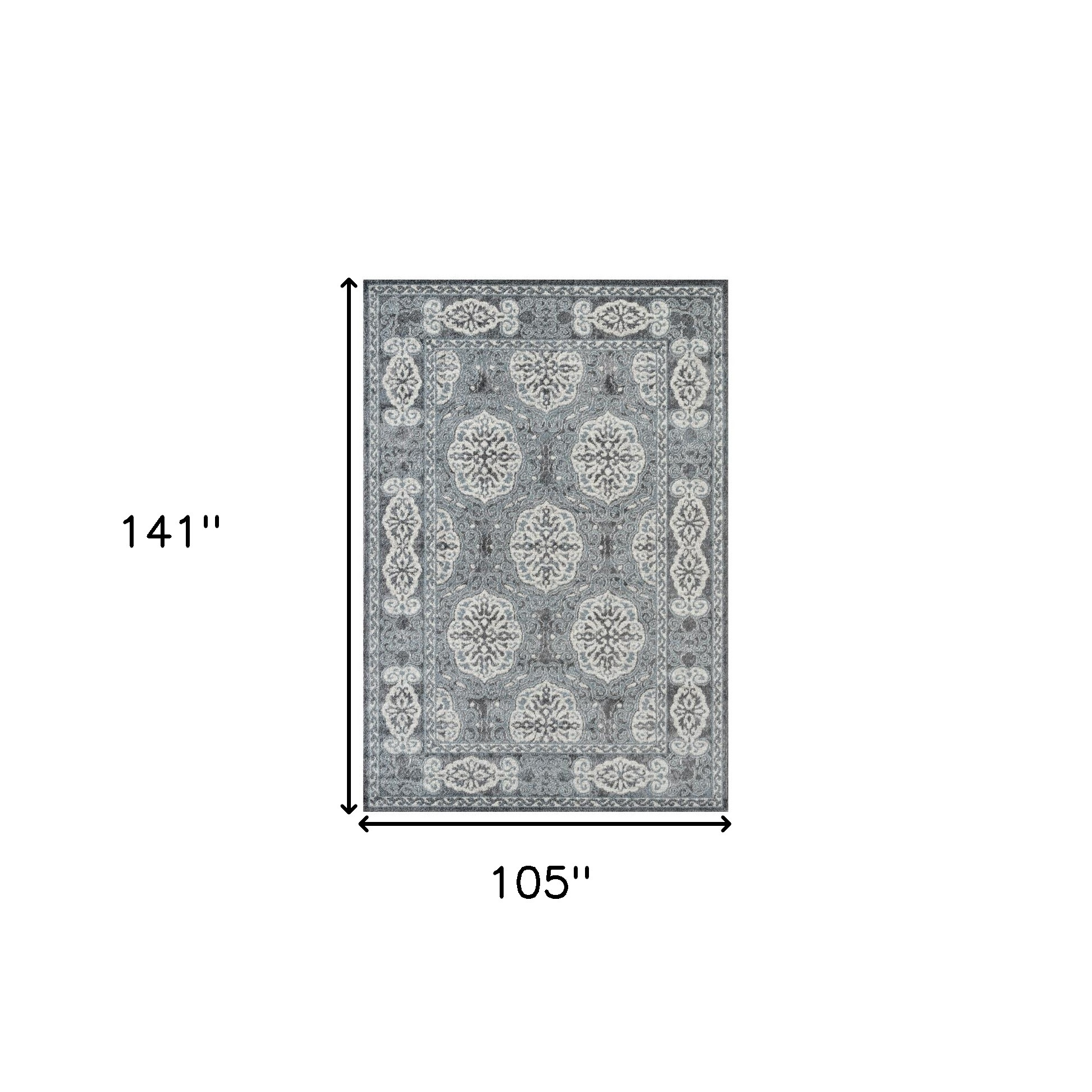 Set an inviting tone in your space with this 9-foot x 12-foot charcoal and ivory medallion area rug. Ideal for spaces with kids and pets, this rug is stain resistant to help repel dirt and spilled liquids. Built to last, this rug crafted from polypropylene fibers is known for its durability and long lasting appeal. Rugs are a great way to showcase your style, hide imperfections, warm your home and reduce noise. This larger sized, contemporary styled rug is ready to create a focal point or statement piece in your room. 105.00-inch h x 141.00-inch w x 0.38-inch d.