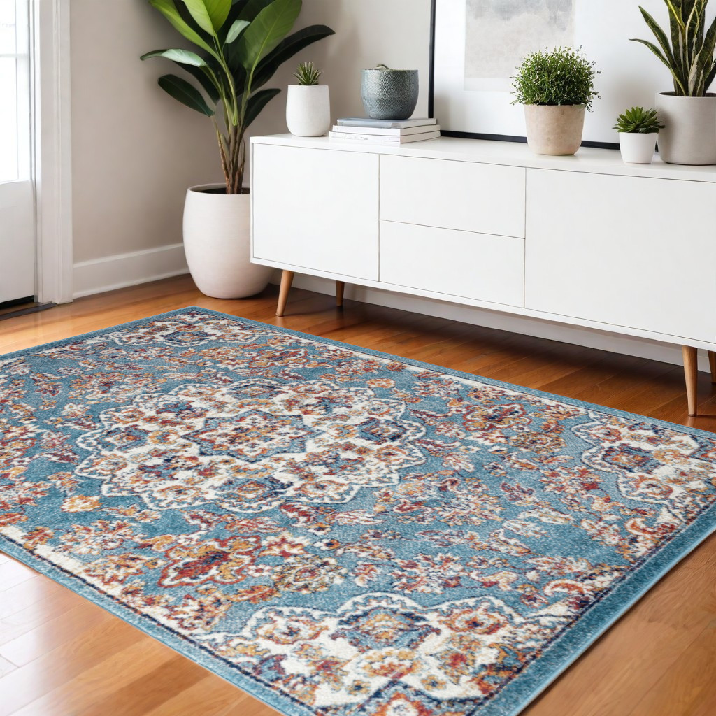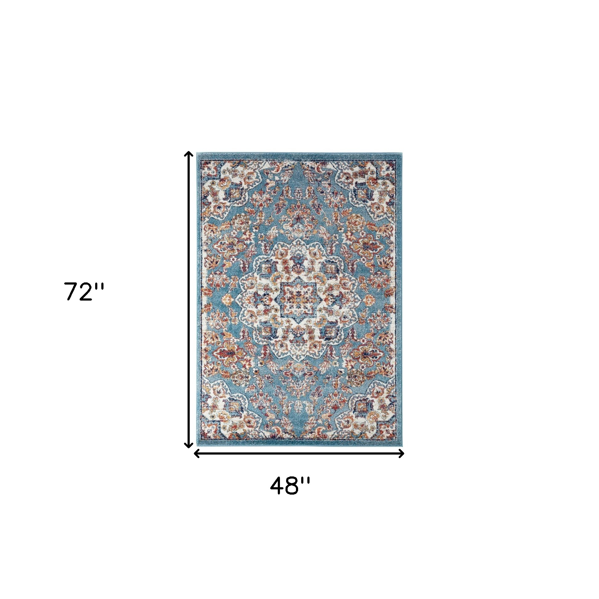 Add some artistry to your room with this 4-foot x 6-foot ivory blue and orange medallion power loom area rug. This rectangle shaped rug features a medallion design that will add a functional and decorative accent to your space. Ideal for spaces with kids and pets, this rug is stain resistant to help repel dirt and spilled liquids. This smaller sized rug is just what you need for your walkway, or in front of door, cabinet, refrigerator, or chair. 48-inch h x 72-inch w x 0.38-inch d
