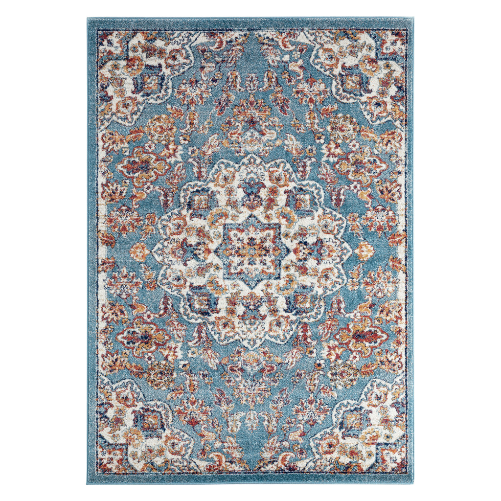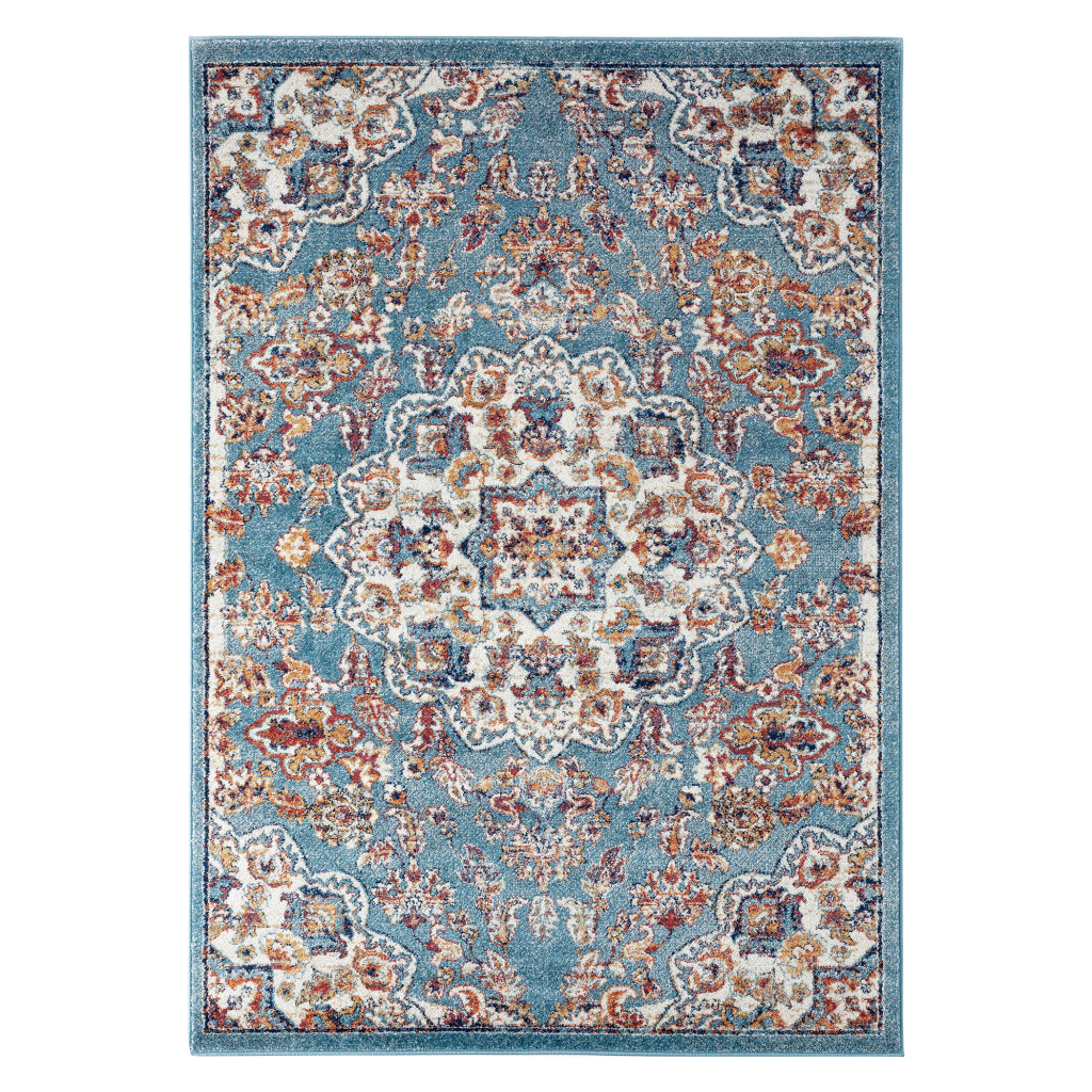 This 5-foot x 8-foot ivory blue and orange medallion power loom area rug, is a great way to add warmth to a room. This rectangle shaped rug features a medallion design that will add a functional and decorative accent to your space. Ideal for spaces with kids and pets, this rug is stain resistant to help repel dirt and spilled liquids. This larger sized rug is ideal to create a focal point or statement piece in your room. 61-inch h x 90-inch w x 0.38-inch d