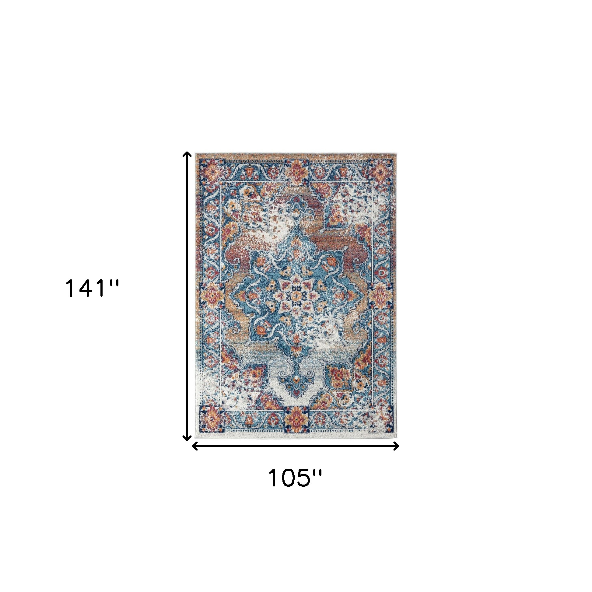 This 9-foot x 12-foot ivory blue and orange medallion area rug, is a great way to add warmth to a room. Ideal for spaces with kids and pets, this rug is stain resistant to help repel dirt and spilled liquids. Built to last, this rug crafted from polypropylene fibers is known for its durability and long lasting appeal. Rugs are a great way to showcase your style, hide imperfections, warm your home and reduce noise. This larger sized, contemporary styled rug is ready to create a focal point or statement piece in your room. 105.00-inch h x 141.00-inch w x 0.38-inch d.