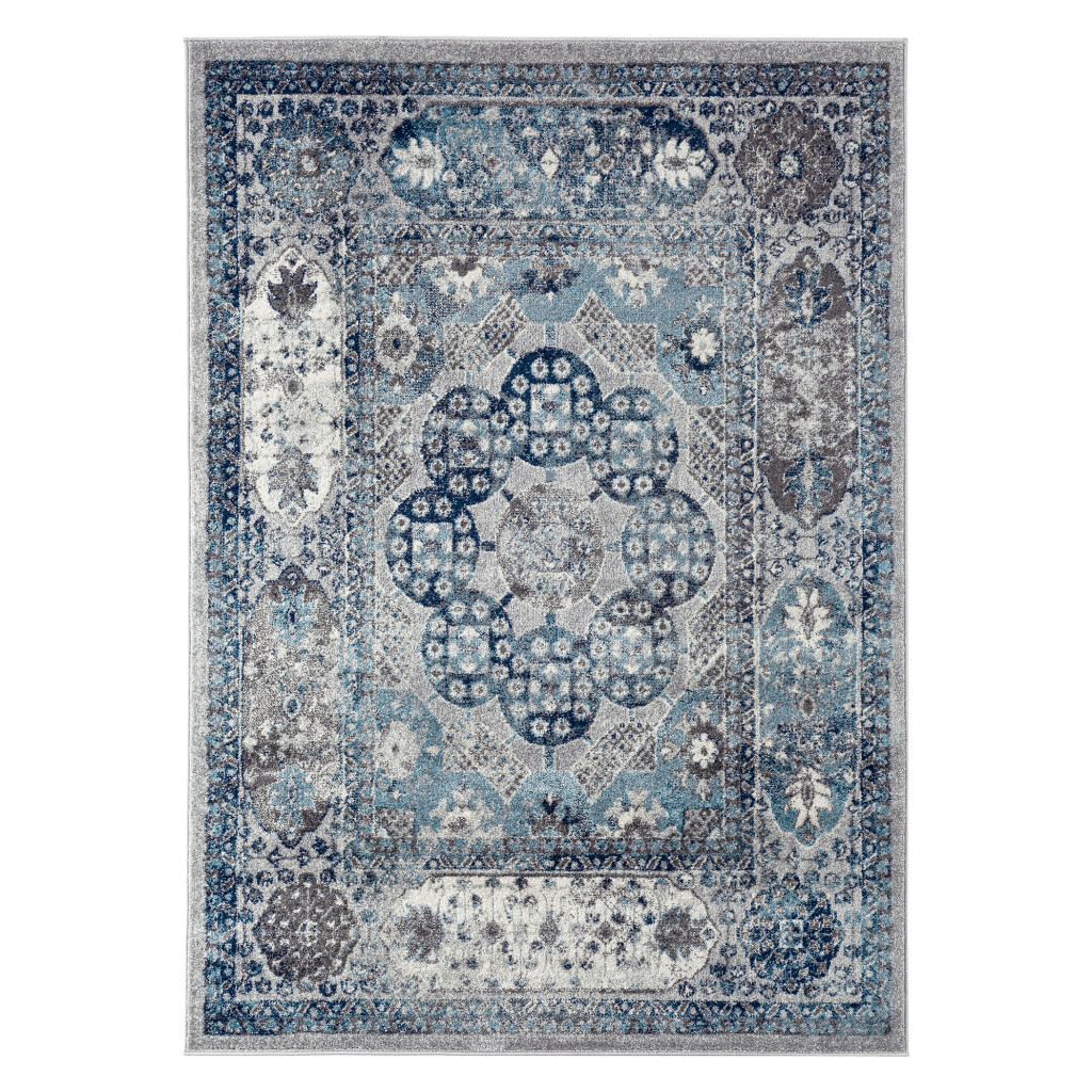This 2-foot x 3-foot ivory blue and gray medallion area rug, is a great way to add warmth to a room. Ideal for spaces with kids and pets, this rug is stain resistant to help repel dirt and spilled liquids. Built to last, this rug crafted from polypropylene fibers is known for its durability and long lasting appeal. Rugs are a great way to showcase your style, hide imperfections, warm your home and reduce noise. This smaller sized, contemporary styled rug is just what you need for your walkway, bedside, in front of door, cabinet, refrigerator, or chair. 24-inch h x 36-inch w x 0.38-inch d.
