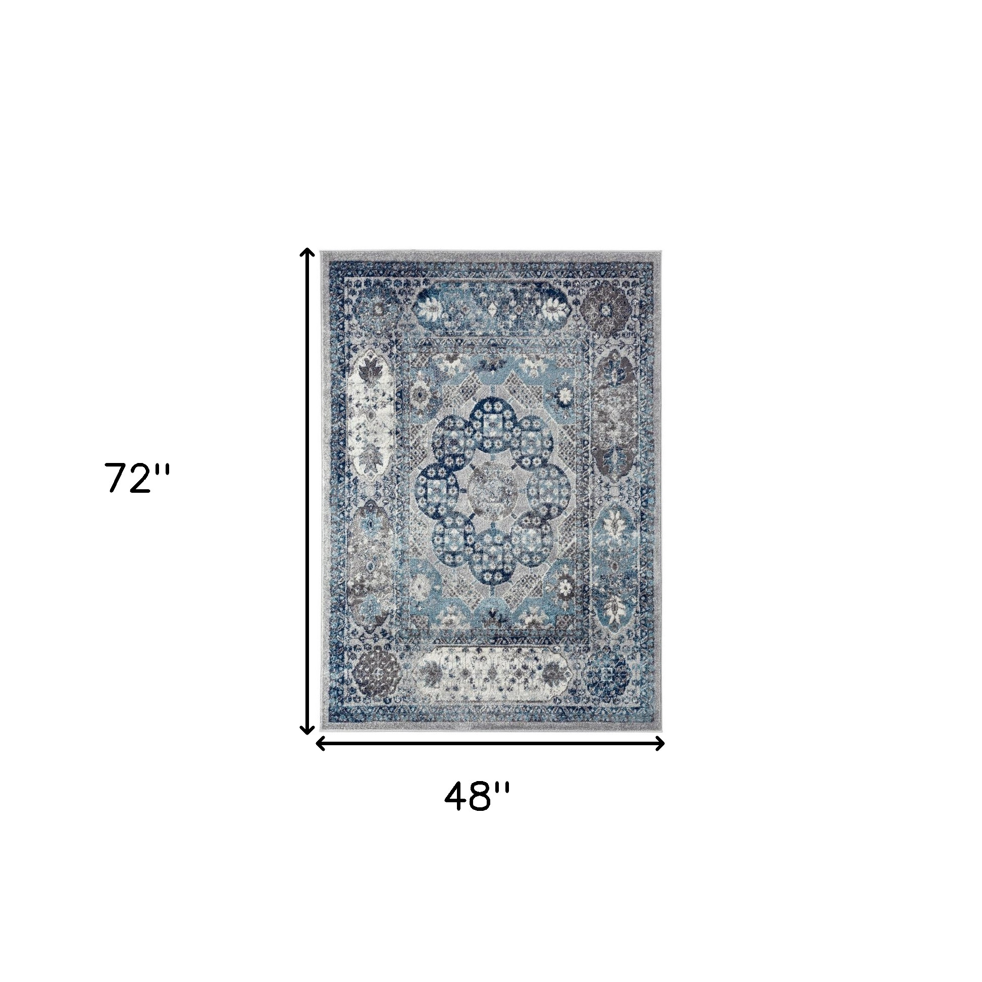 This 4-foot x 6-foot ivory blue and gray medallion area rug, is a great way to add warmth to a room. Ideal for spaces with kids and pets, this rug is stain resistant to help repel dirt and spilled liquids. Built to last, this rug crafted from polypropylene fibers is known for its durability and long lasting appeal. Rugs are a great way to showcase your style, hide imperfections, warm your home and reduce noise. This smaller sized, contemporary styled rug is just what you need for your walkway, bedside, in front of door, cabinet, refrigerator, or chair. 48.00-inch h x 72.00-inch w x 0.38-inch d.