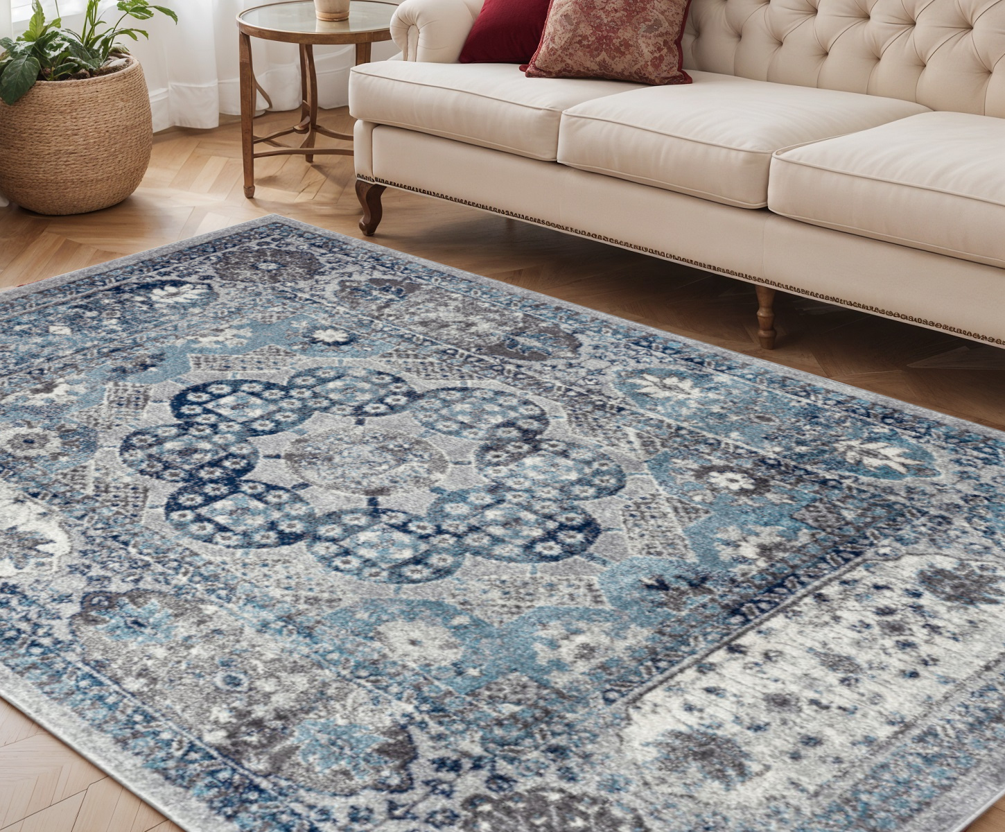 Add great coloration and comfortable texture to your space with this 5-foot x 8-foot ivory blue and gray medallion area rug. Ideal for spaces with kids and pets, this rug is stain resistant to help repel dirt and spilled liquids. Built to last, this rug crafted from polypropylene fibers is known for its durability and long lasting appeal. Rugs are a great way to showcase your style, hide imperfections, warm your home and reduce noise. This larger sized, contemporary styled rug is ready to create a focal point or statement piece in your room. 61-inch h x 90-inch w x 0.38-inch d.