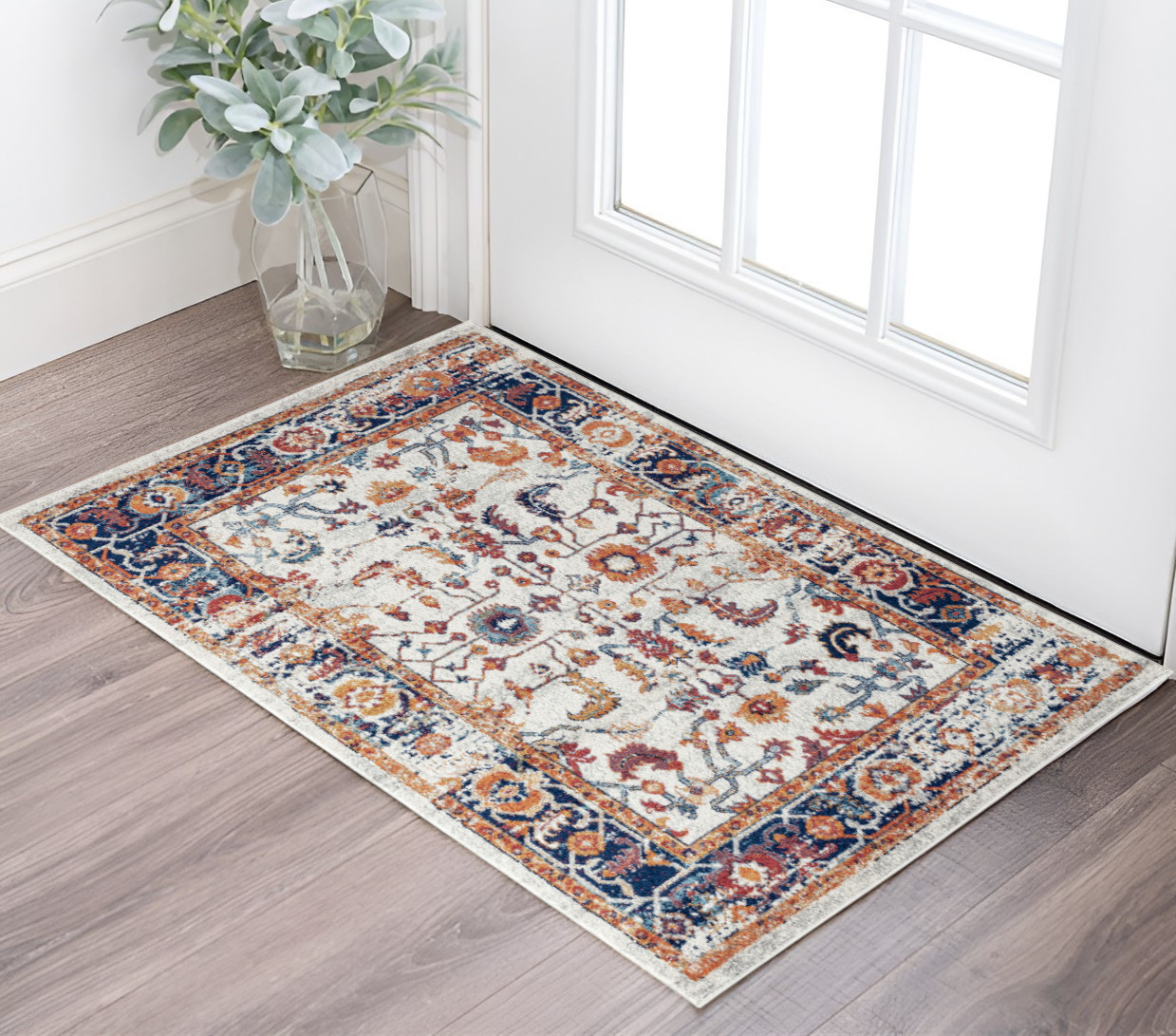 Add great coloration and comfortable texture to your space with this 2-foot x 3-foot ivory navy and orange floral power loom area rug. This rectangle shaped rug features a floral design in ivory navy and orange to give it visual interest. A classic shape marries with good looking design for your space ideal for spaces with kids and pets, this rug is stain resistant to help repel stains and spilled liquids. Area rugs help to give warmth and sense of home to your space. 24-inch H x 36-inch W x 0.38-inch D