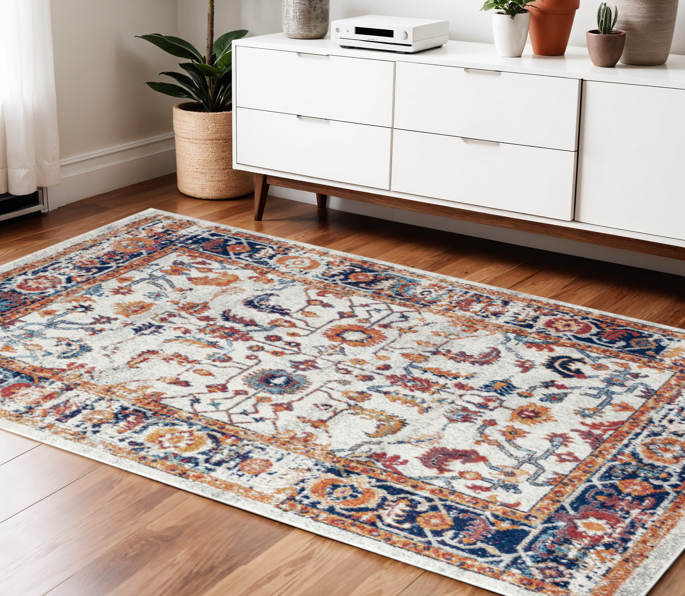 Set an inviting tone in your space with this 4-foot x 6-foot ivory navy and orange floral power loom area rug. This rectangle shaped rug features a floral design in ivory navy and orange to give it visual interest. A classic shape marries with good looking design for your space ideal for spaces with kids and pets, this rug is stain resistant to help repel stains and spilled liquids. Place this area rug against a hardwood or tile floor and it will enliven your living space with style and sophistication. 48-inch H x 72-inch W x 0.38-inch D