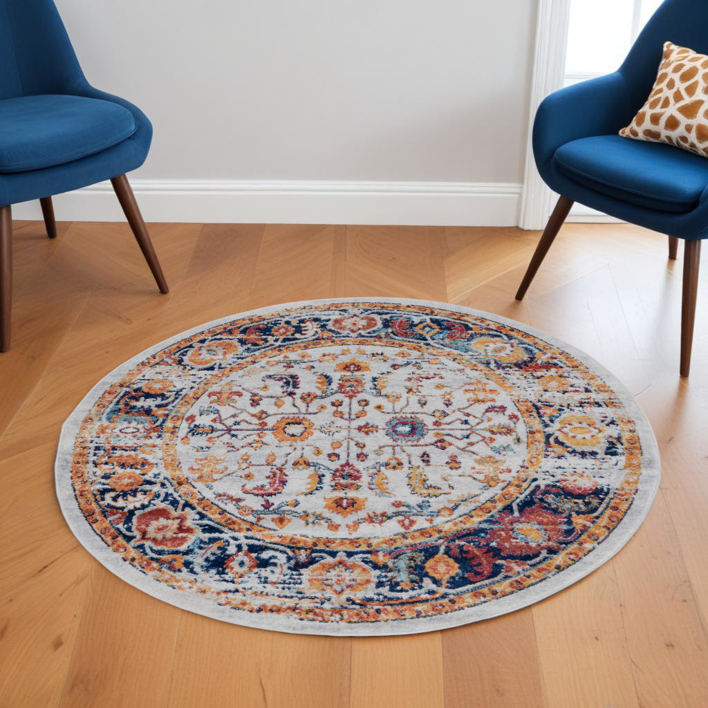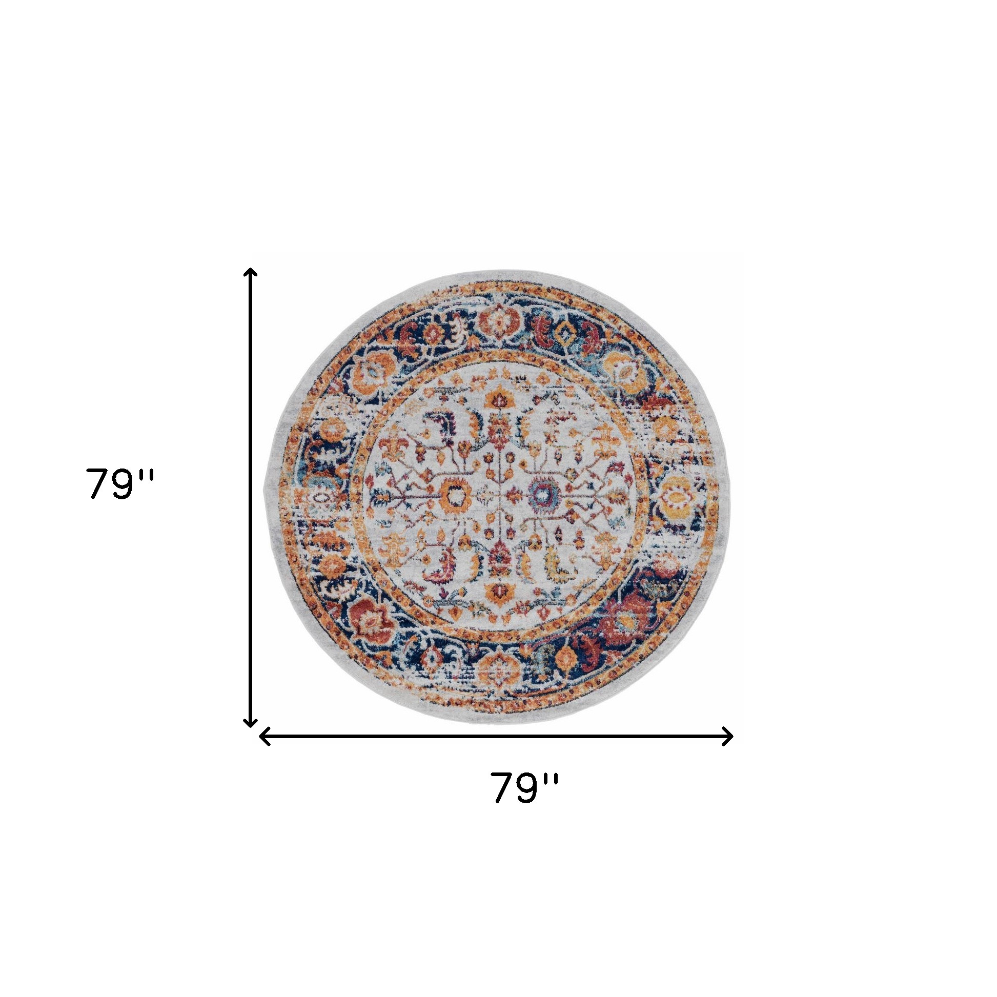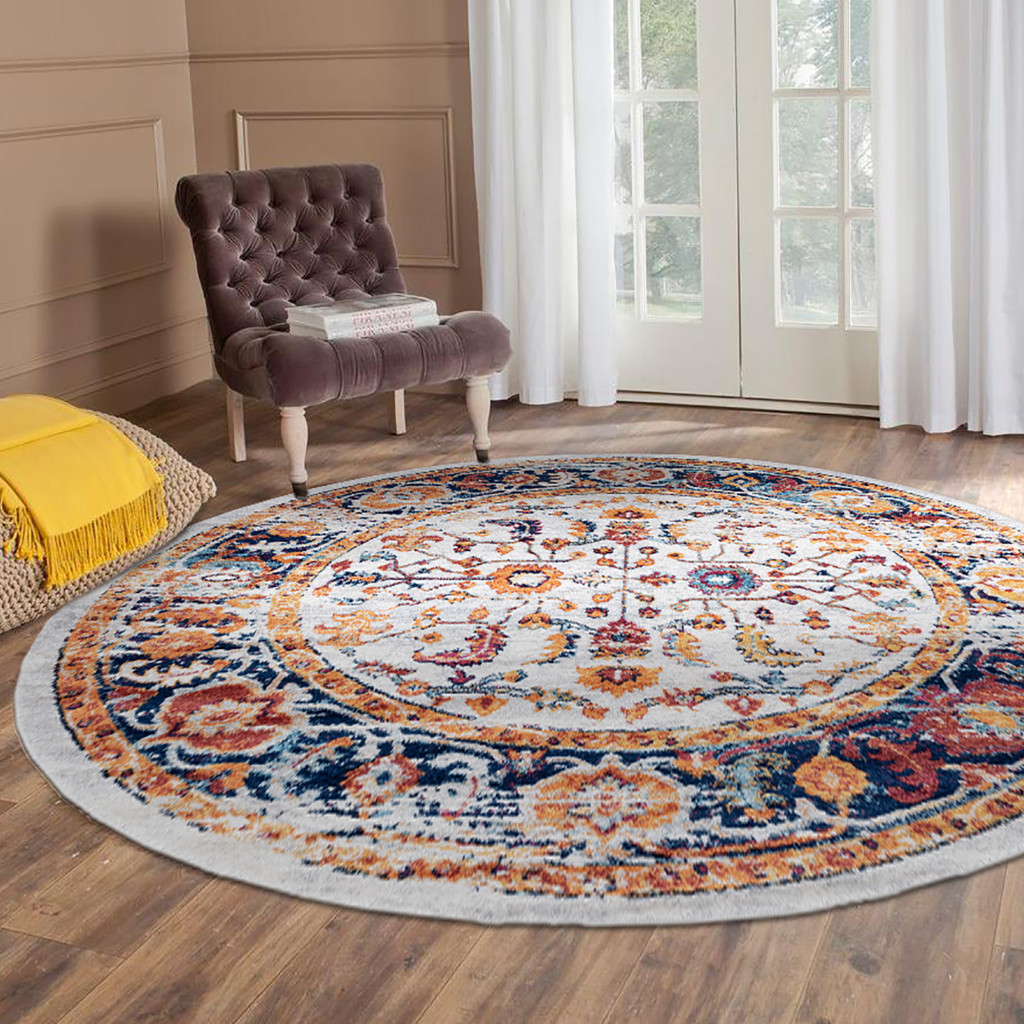 This 6-foot ivory and orange floral round rug, is a great way to add warmth to a room. Ideal for spaces with kids and pets, this rug is stain resistant to help repel dirt and spilled liquids. Built to last, this rug crafted from polypropylene fibers is known for its durability and long lasting appeal. Rugs are a great way to showcase your style, hide imperfections, warm your home and reduce noise. This larger sized, contemporary styled rug is ready to create a focal point or statement piece in your room. 79.00-inch h x 79.00-inch w x 0.38-inch d.