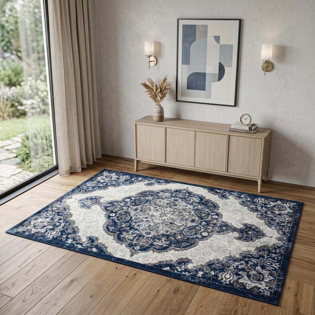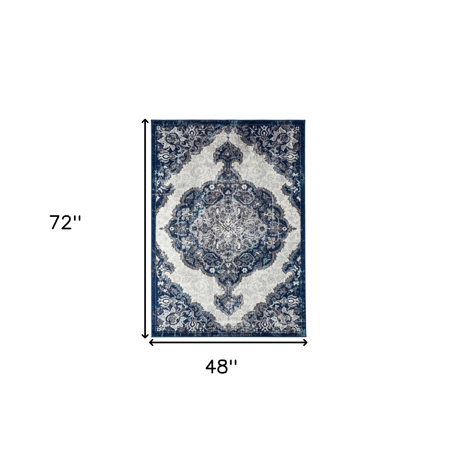 This 4-foot x 6-foot ivory gray and blue medallion area rug, is a great way to add warmth to a room. Ideal for spaces with kids and pets, this rug is stain resistant to help repel dirt and spilled liquids. Built to last, this rug crafted from polypropylene fibers is known for its durability and long lasting appeal. Rugs are a great way to showcase your style, hide imperfections, warm your home and reduce noise. This smaller sized, contemporary styled rug is just what you need for your walkway, bedside, in front of door, cabinet, refrigerator, or chair. 48.00-inch h x 72.00-inch w x 0.38-inch d.