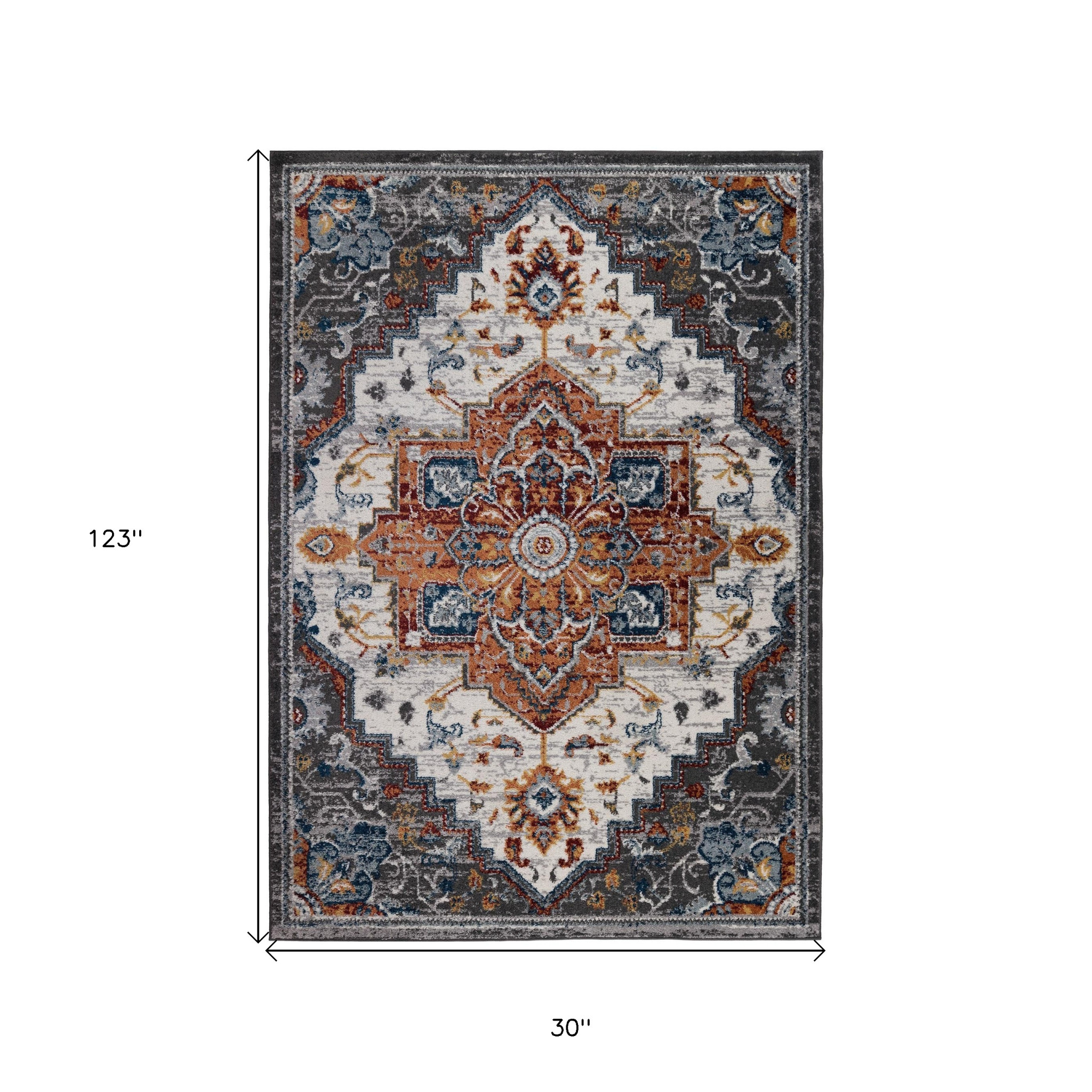 Set an inviting tone in your space with this 10-foot gray rust and orange medallion power loom runner rug. This runner shaped rug features a medallion design in gray rust and orange to give it visual interest. A classic shape marries with good looking design for your space ideal for spaces with kids and pets, this rug is stain resistant to help repel stains and spilled liquids. Place this area rug against a hardwood or tile floor and it will enliven your living space with style and sophistication. 30-inch H x 123-inch W x 0.38-inch D