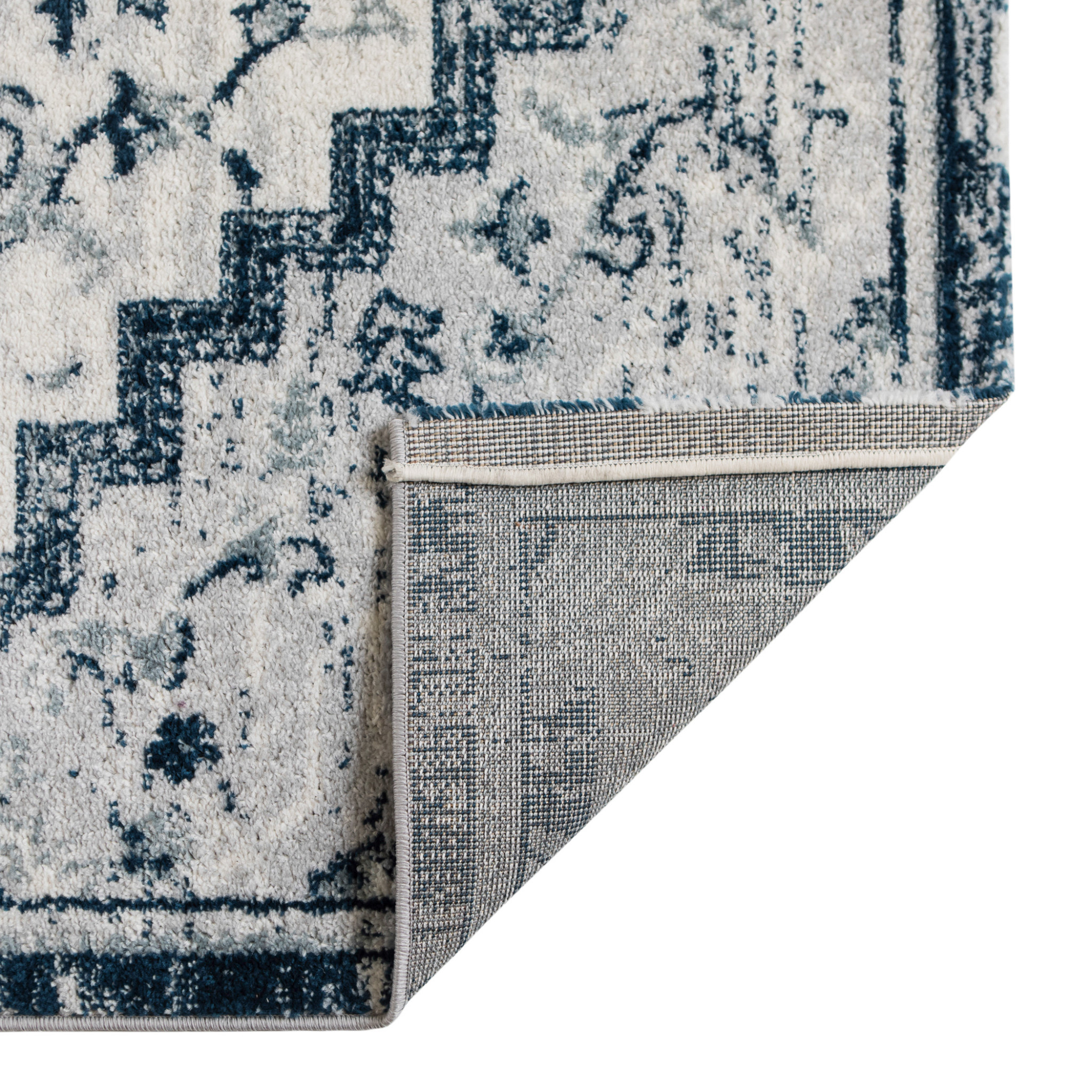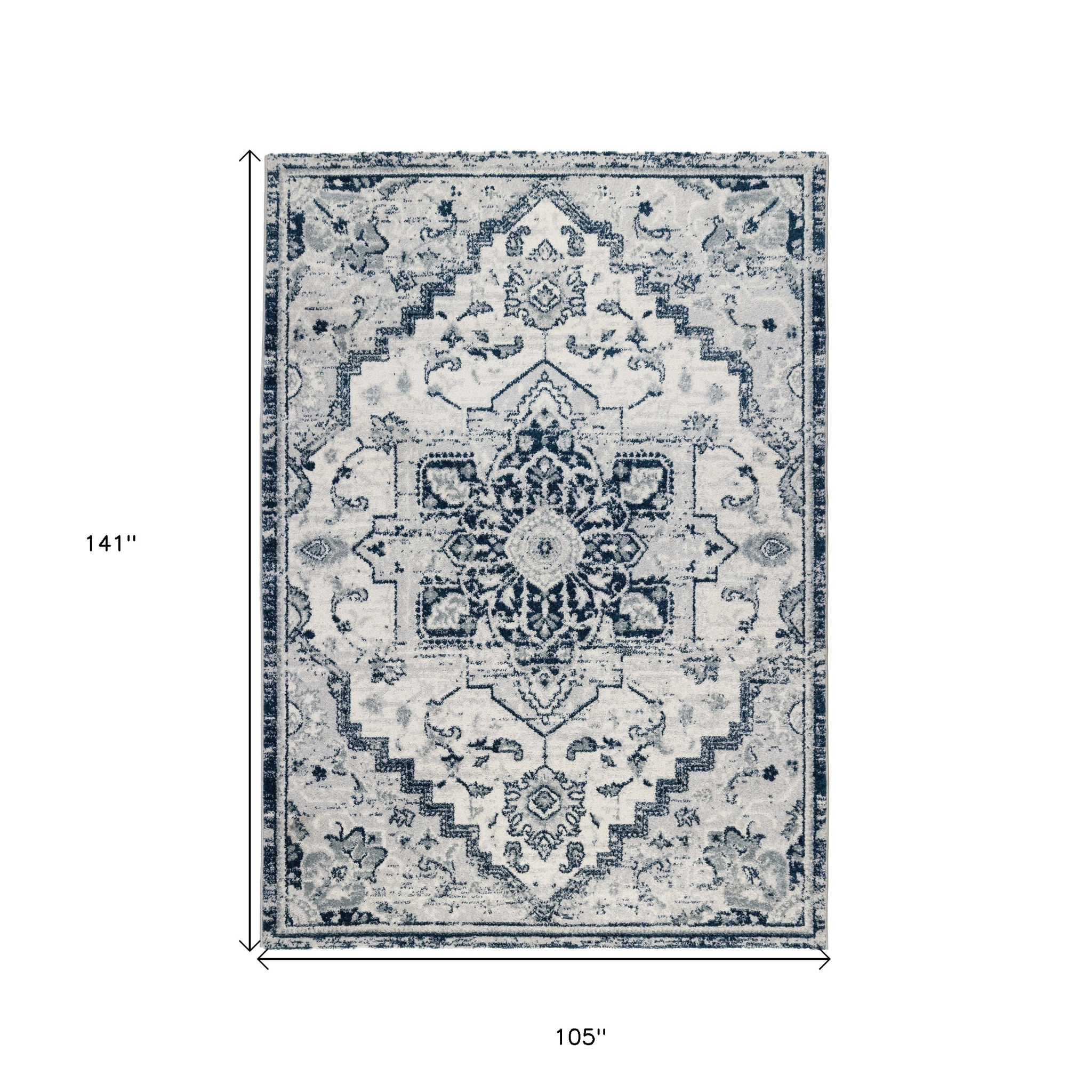 Add some artistry to your room with this 9-foot x 12-foot ivory and blue medallion area rug. Ideal for spaces with kids and pets, this rug is stain resistant to help repel dirt and spilled liquids. Built to last, this rug crafted from polypropylene fibers is known for its durability and long lasting appeal. Rugs are a great way to showcase your style, hide imperfections, warm your home and reduce noise. This larger sized, traditional styled rug is ready to create a focal point or statement piece in your room. 105.00-inch h x 141.00-inch w x 0.38-inch d.