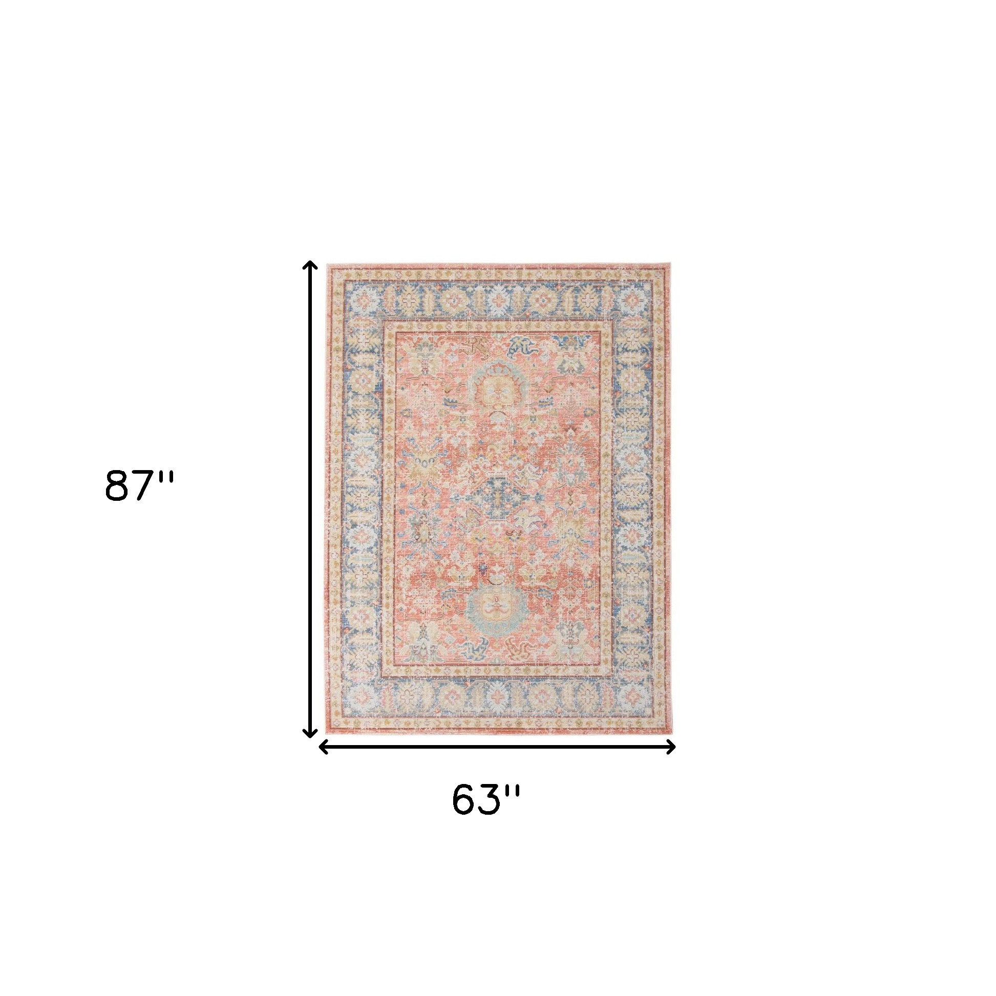 Add great coloration and comfortable texture to your space with this 5-foot x 8-foot coral and blue oriental area rug. Built to last, this rug crafted from polyester fibers is known for its durability and long lasting appeal. Rugs are a great way to showcase your style, hide imperfections, warm your home and reduce noise. This larger sized, traditional styled rug is ready to create a focal point or statement piece in your room. 63.00-inch h x 87.00-inch w x 0.08-inch d.