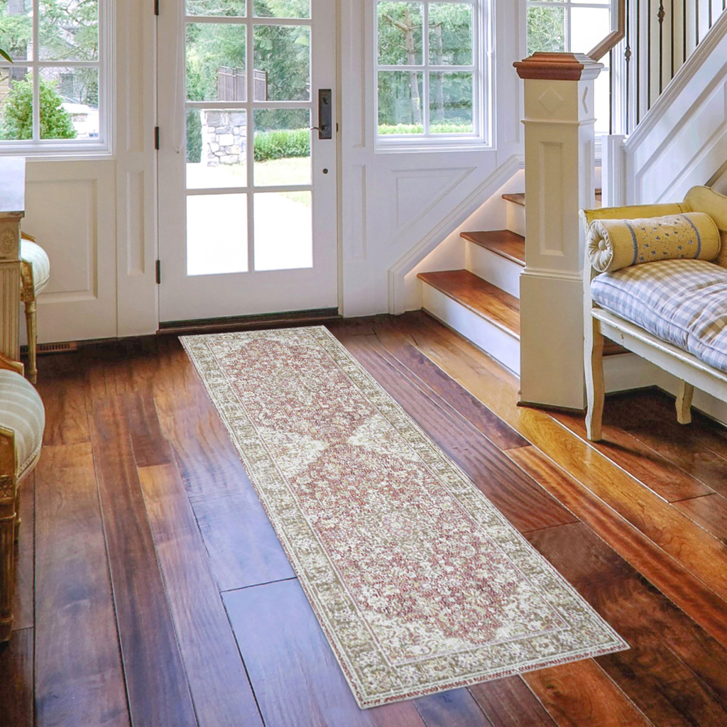 This 8-foot pink and gray medallion runner rug, is a great way to add warmth to a room. Built to last, this rug crafted from polyester fibers is known for its durability and long lasting appeal. Rugs are a great way to showcase your style, hide imperfections, warm your home and reduce noise. This traditional style runner makes a great accent for the hallway, in front of cabinets, in the laundry room, or any other space you need a narrow and long rug. 30.00-inch h x 96.00-inch w x 0.08-inch d.