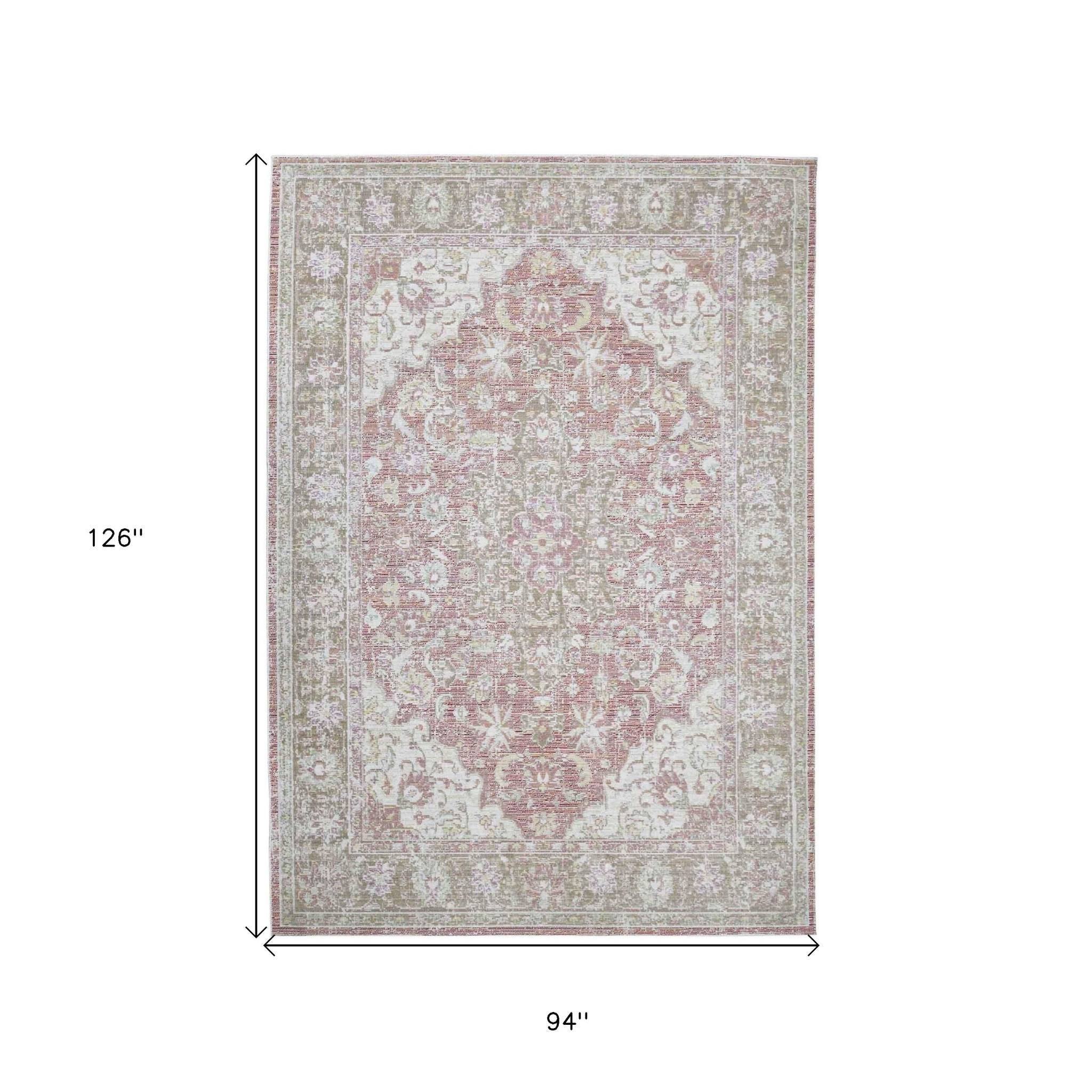 This 8-foot x 10-foot pink and gray medallion area rug, is a great way to add warmth to a room. Built to last, this rug crafted from polyester fibers is known for its durability and long lasting appeal. Rugs are a great way to showcase your style, hide imperfections, warm your home and reduce noise. This larger sized, traditional styled rug is ready to create a focal point or statement piece in your room. 94.00-inch h x 126.00-inch w x 0.08-inch d.