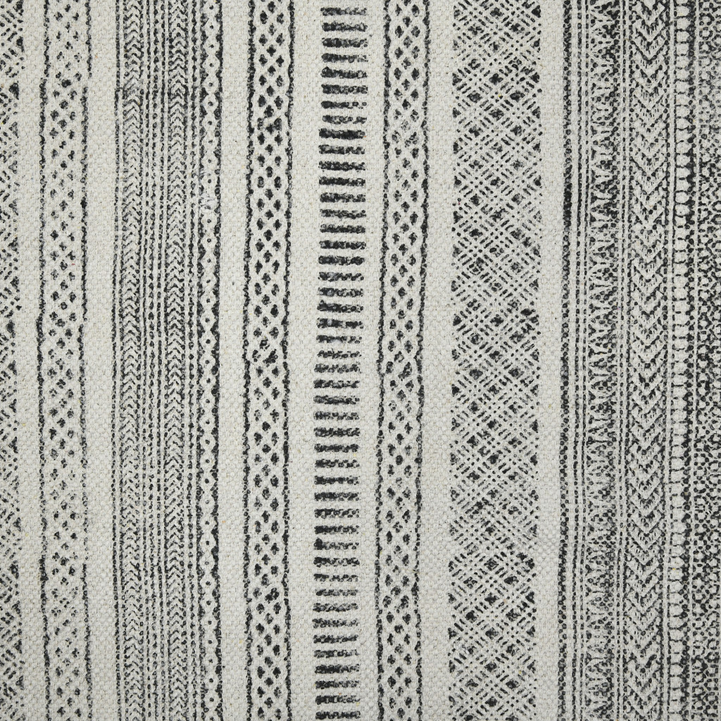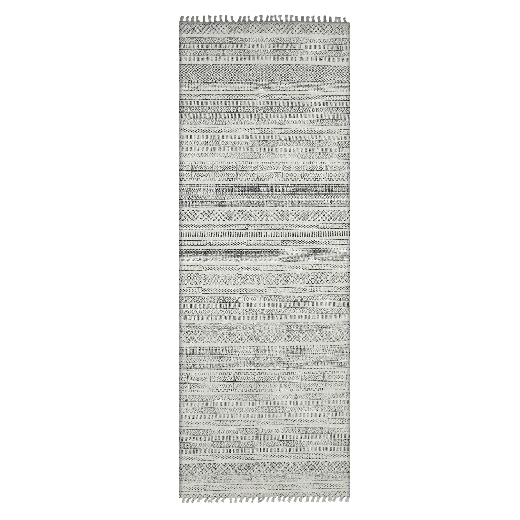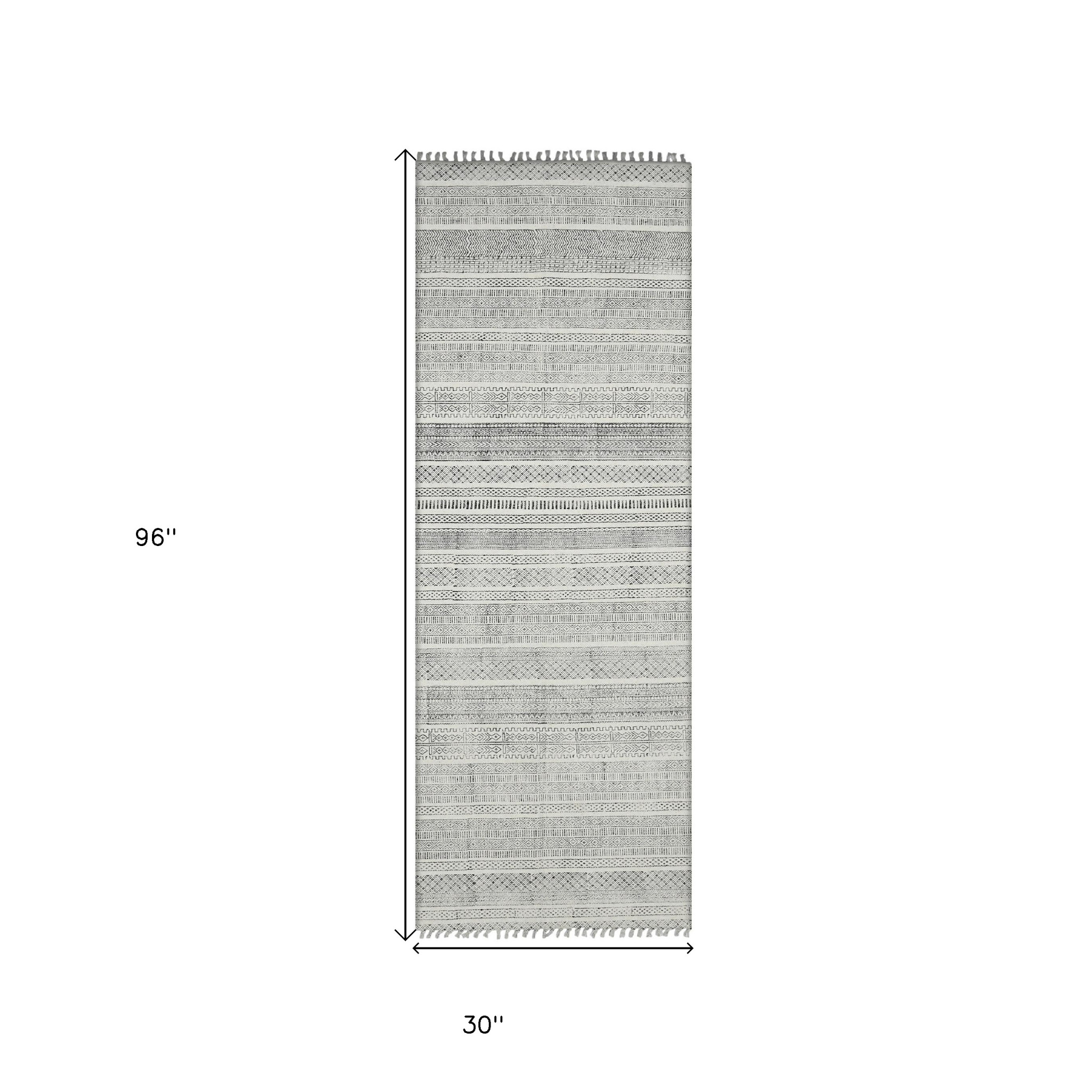 Add some artistry to your room with this 8-foot ivory black and gray geometric flatweave handmade distressed runner rug with fringe. Rugs are a great way to showcase your style, hide imperfections, warm your home and reduce noise. Tassel ends bring a timeless and fashionable look to your interior. This contemporary style runner makes a great accent for the hallway, in front of cabinets, in the laundry room, or any other space you need a narrow and long rug. 30.00-inch h x 96.00-inch w x 0.20-inch d.