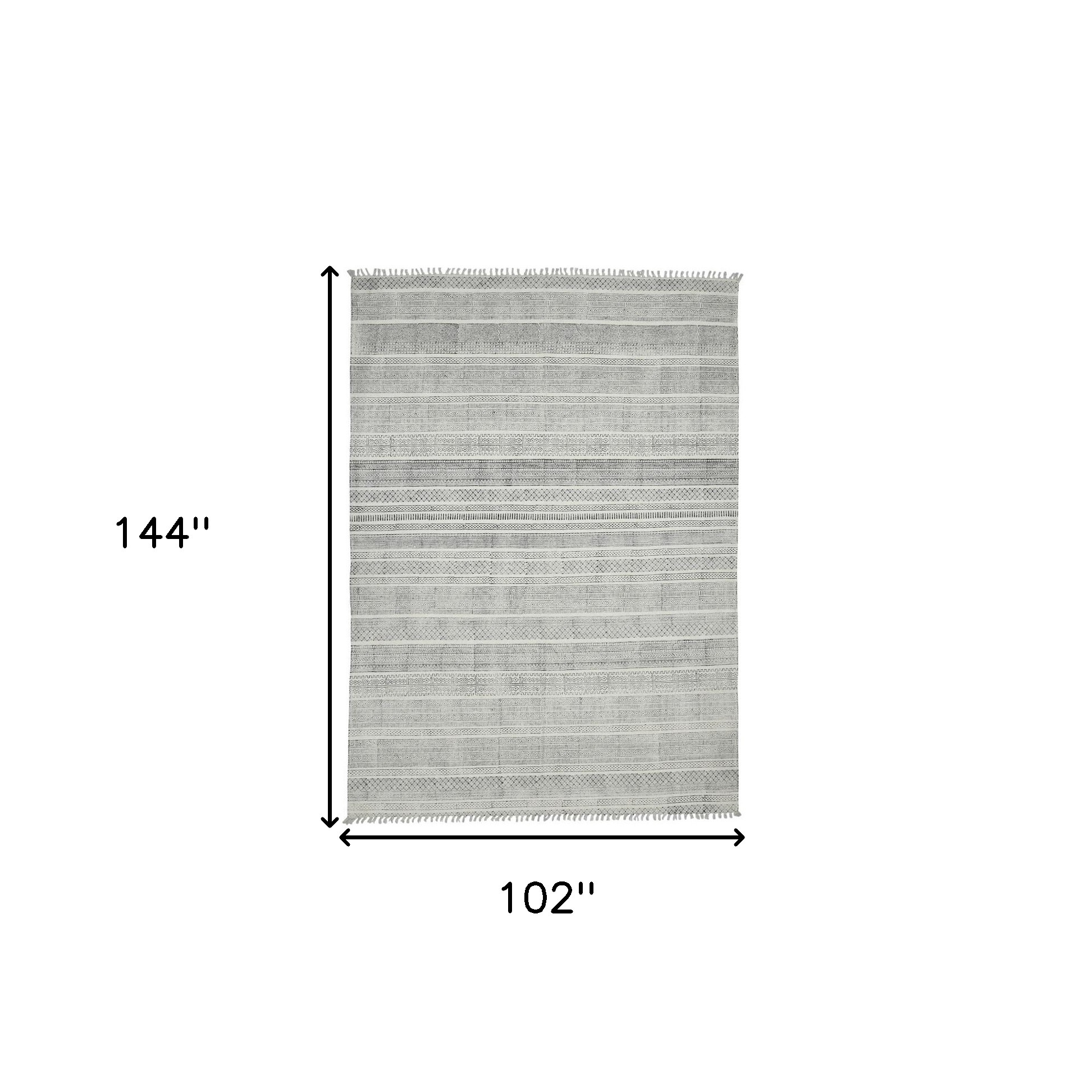 This 9-foot x 12-foot ivory black and gray geometric flatweave handmade distressed area rug with fringe, is a great way to add warmth to a room. Rugs are a great way to showcase your style, hide imperfections, warm your home and reduce noise. Tassel ends bring a timeless and fashionable look to your interior. This larger sized, contemporary styled rug is ready to create a focal point or statement piece in your room. 102.00-inch h x 144.00-inch w x 0.20-inch d.