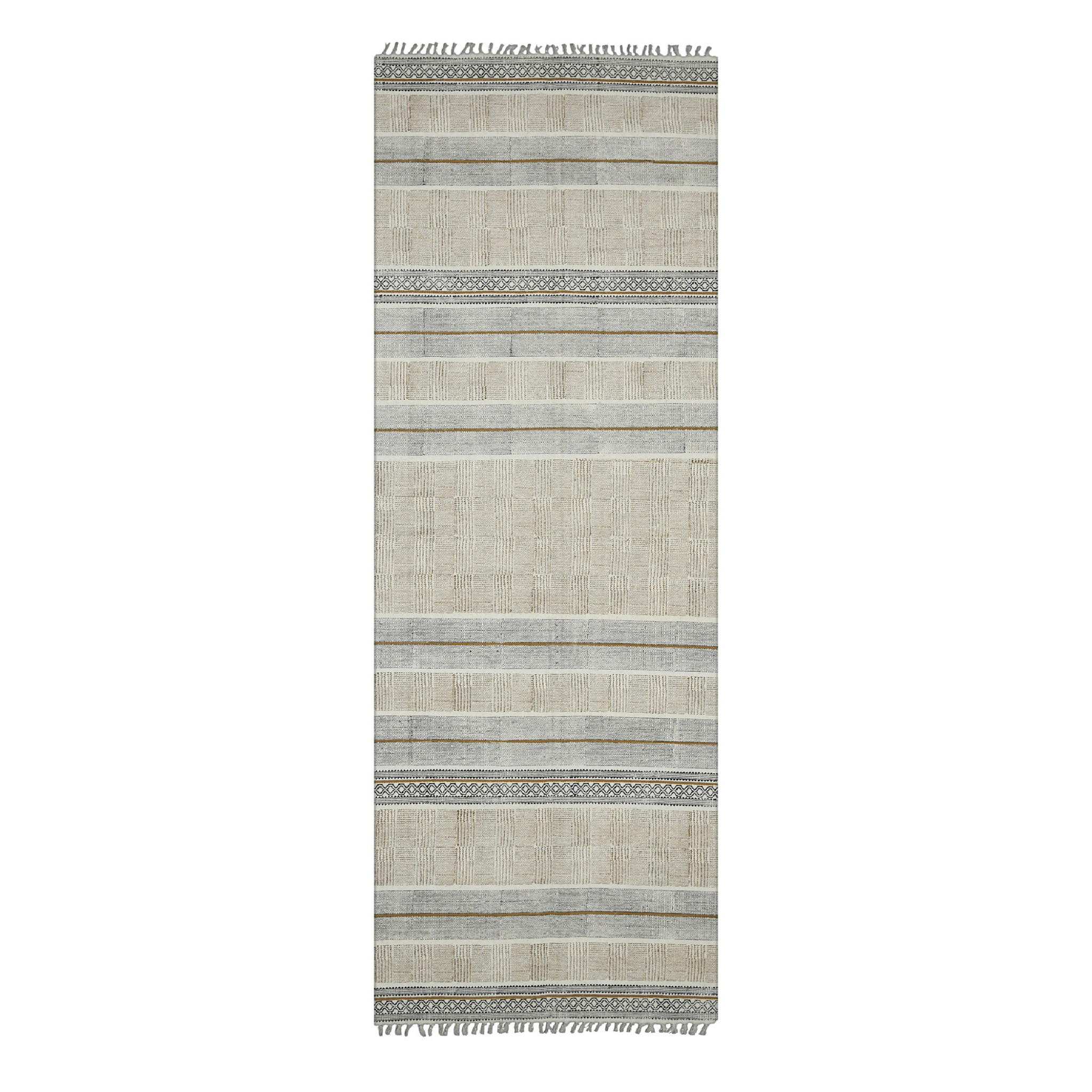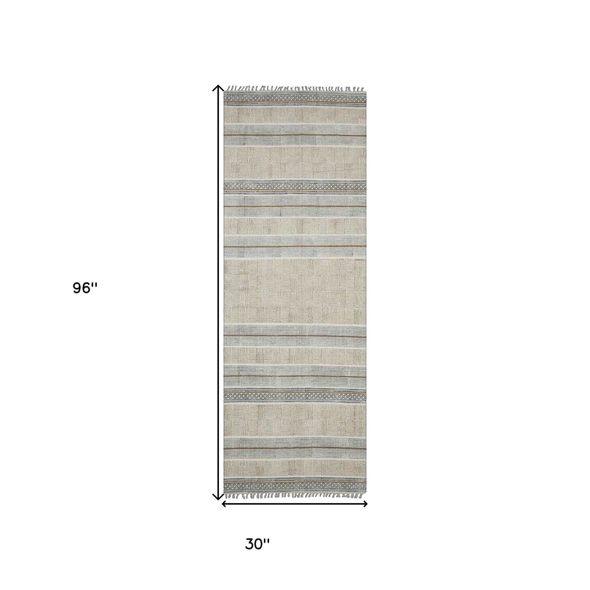 Add great coloration and comfortable texture to your space with this 8-foot gray and brown striped flatweave handmade distressed runner rug with fringe. Rugs are a great way to showcase your style, hide imperfections, warm your home and reduce noise. Tassel ends bring a timeless and fashionable look to your interior. This contemporary style runner makes a great accent for the hallway, in front of cabinets, in the laundry room, or any other space you need a narrow and long rug. 30.00-inch h x 96.00-inch w x 0.20-inch d.
