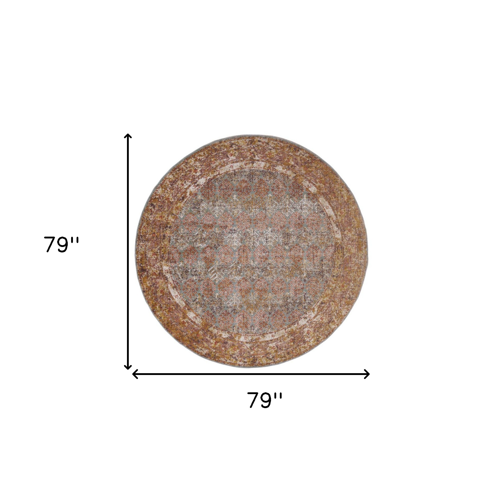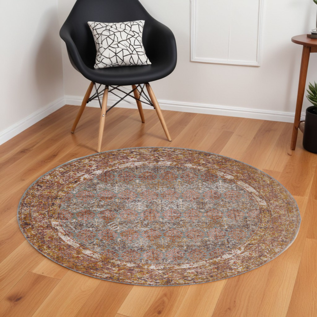 Add some artistry to your room with this 6-foot teal and orange medallion round rug. Ideal for spaces with kids and pets, this rug is stain resistant to help repel dirt and spilled liquids. Built to last, this rug crafted from polypropylene fibers is known for its durability and long lasting appeal. Rugs are a great way to showcase your style, hide imperfections, warm your home and reduce noise. This geometric round shaped rug features a medallion pattern in teal and orange that combines a good looking print with a unique and updated shape. The mix of shape, color, and design gives this rug refreshing visual interest. This larger sized, transitional styled rug is ready to create a focal point or statement piece in your room. 79-inch h x 79-inch w x 0.15-inch d.