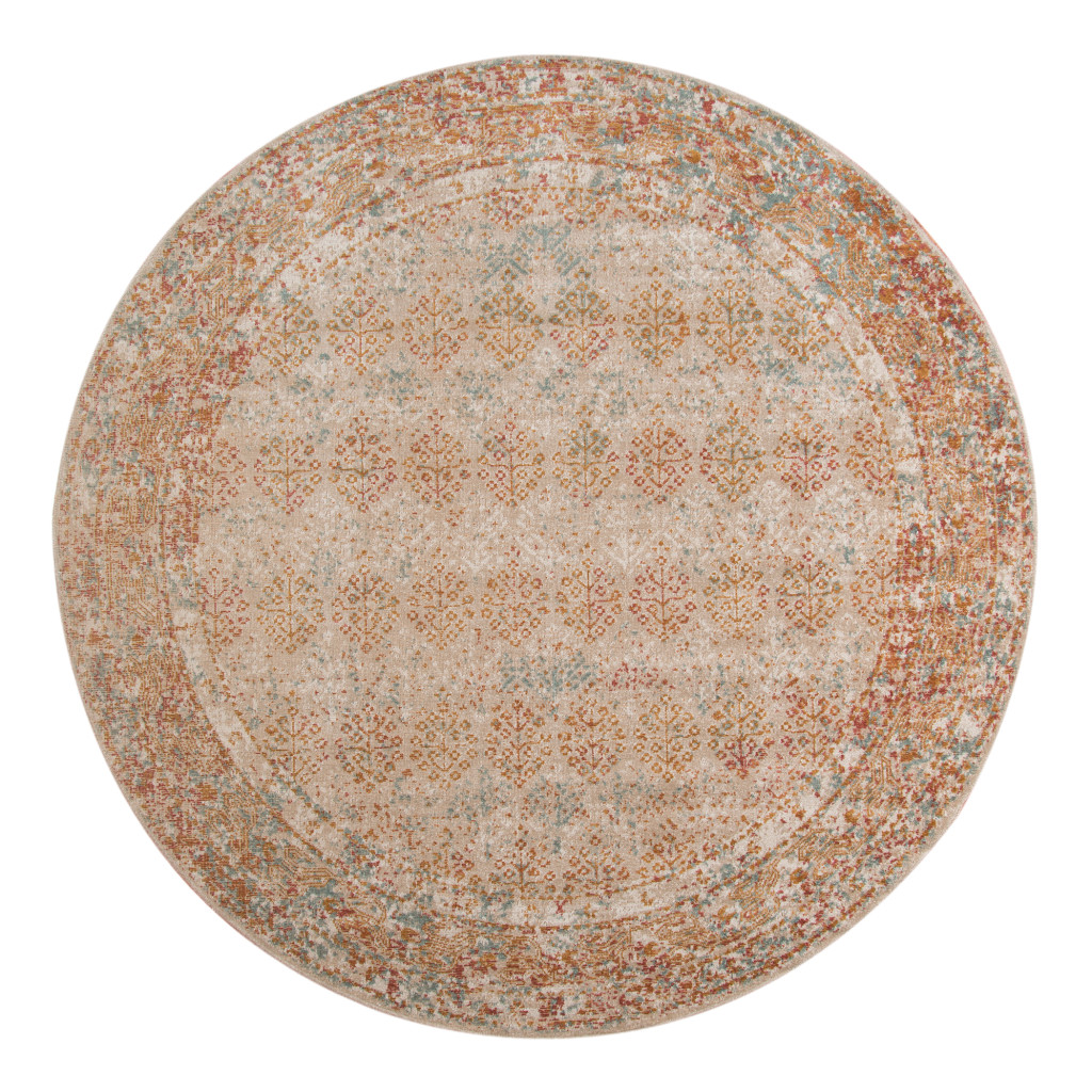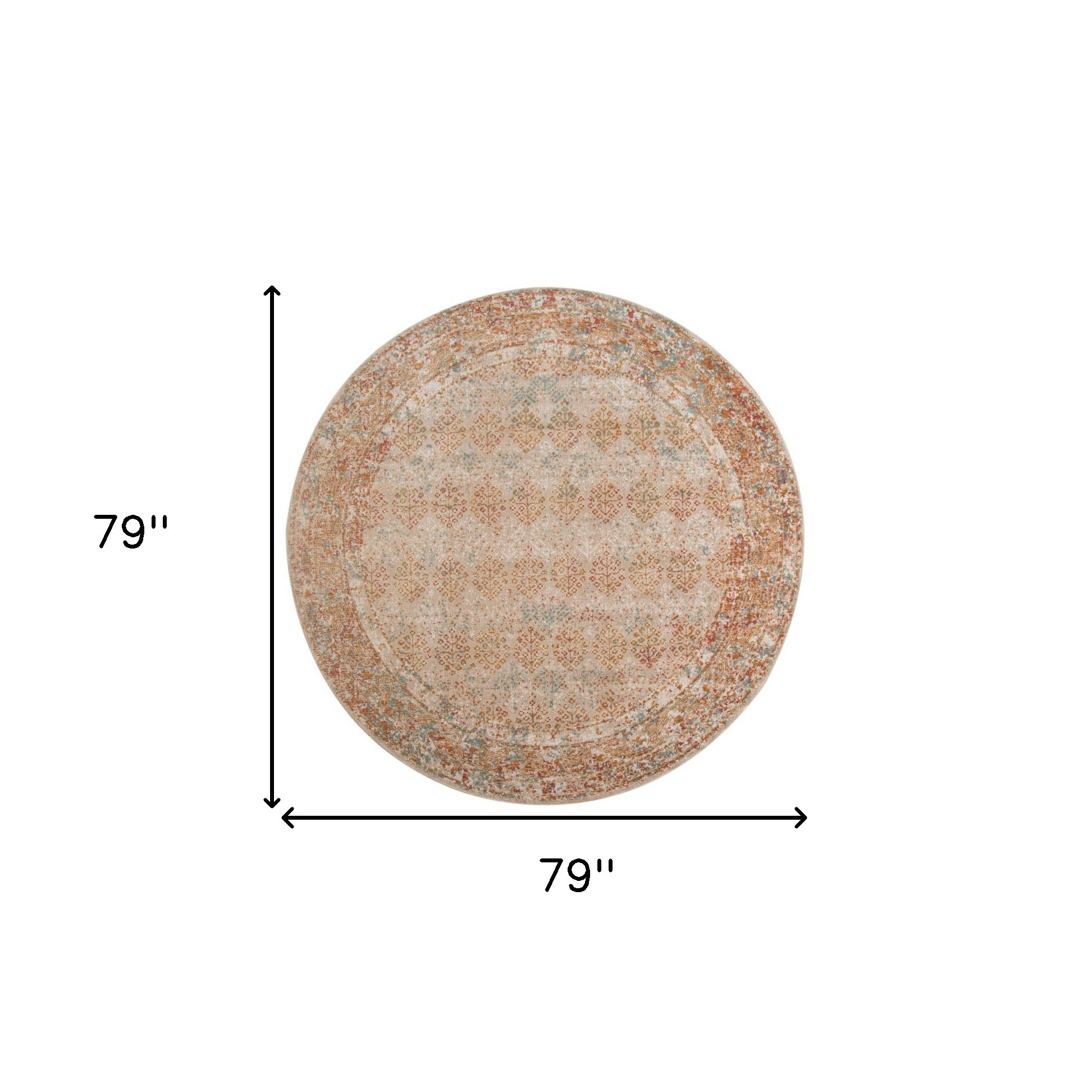 This 6-foot beige orange and teal southwestern round rug, is a great way to add warmth to a room. Ideal for spaces with kids and pets, this rug is stain resistant to help repel dirt and spilled liquids. Built to last, this rug crafted from polypropylene fibers is known for its durability and long lasting appeal. Rugs are a great way to showcase your style, hide imperfections, warm your home and reduce noise. This larger sized, traditional styled rug is ready to create a focal point or statement piece in your room. 79.00-inch h x 79.00-inch w x 0.15-inch d.