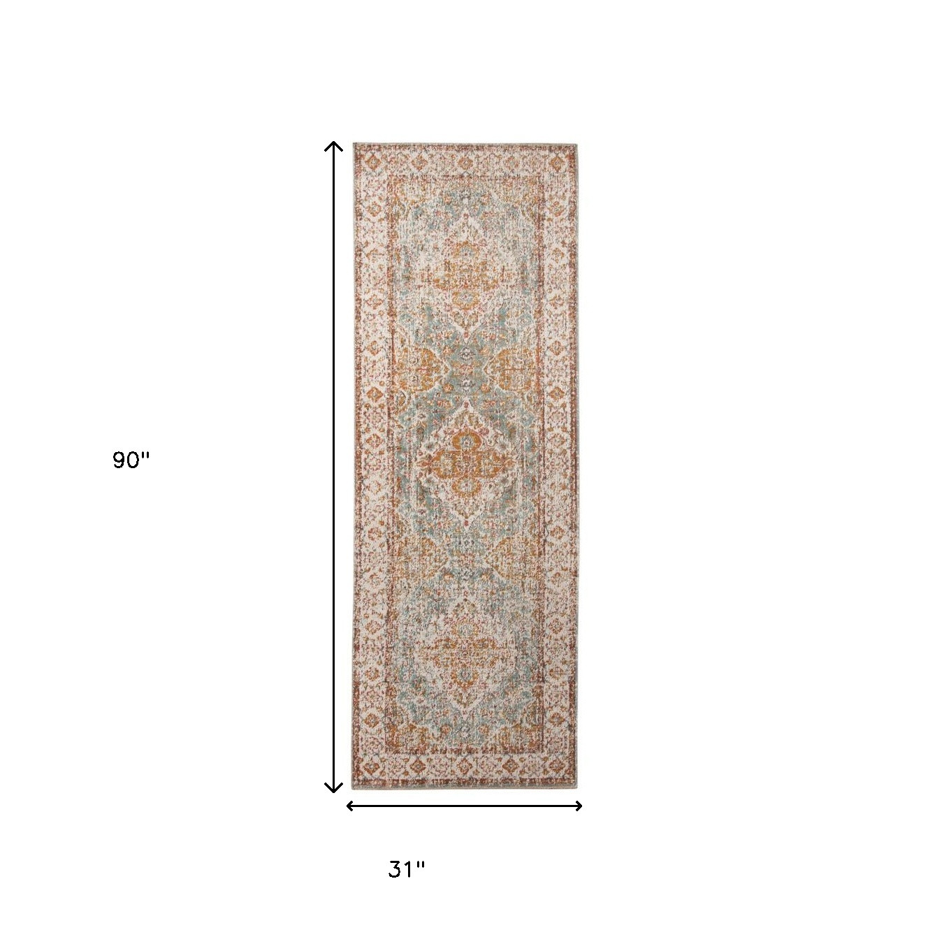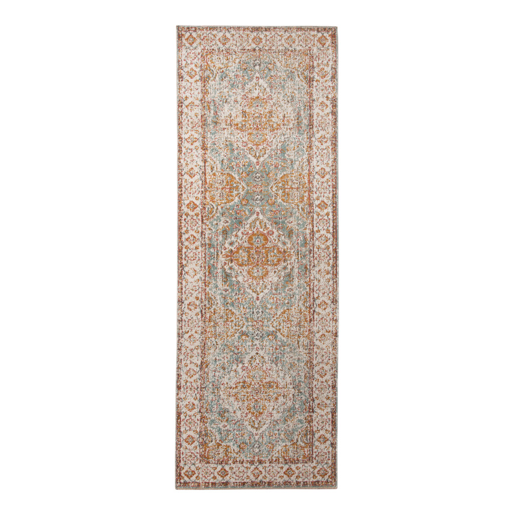 This 7-foot orange light blue and beige oriental runner rug, is a great way to add warmth to a room. Ideal for spaces with kids and pets, this rug is stain resistant to help repel dirt and spilled liquids. Built to last, this rug crafted from polypropylene fibers is known for its durability and long lasting appeal. Rugs are a great way to showcase your style, hide imperfections, warm your home and reduce noise. This transitional style runner makes a great accent for the hallway, in front of cabinets, in the laundry room, or any other space you need a narrow and long rug. 31.00-inch h x 90.00-inch w x 0.15-inch d.