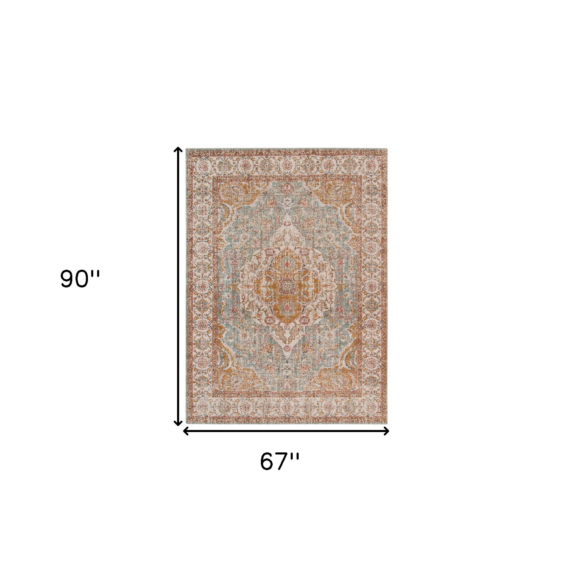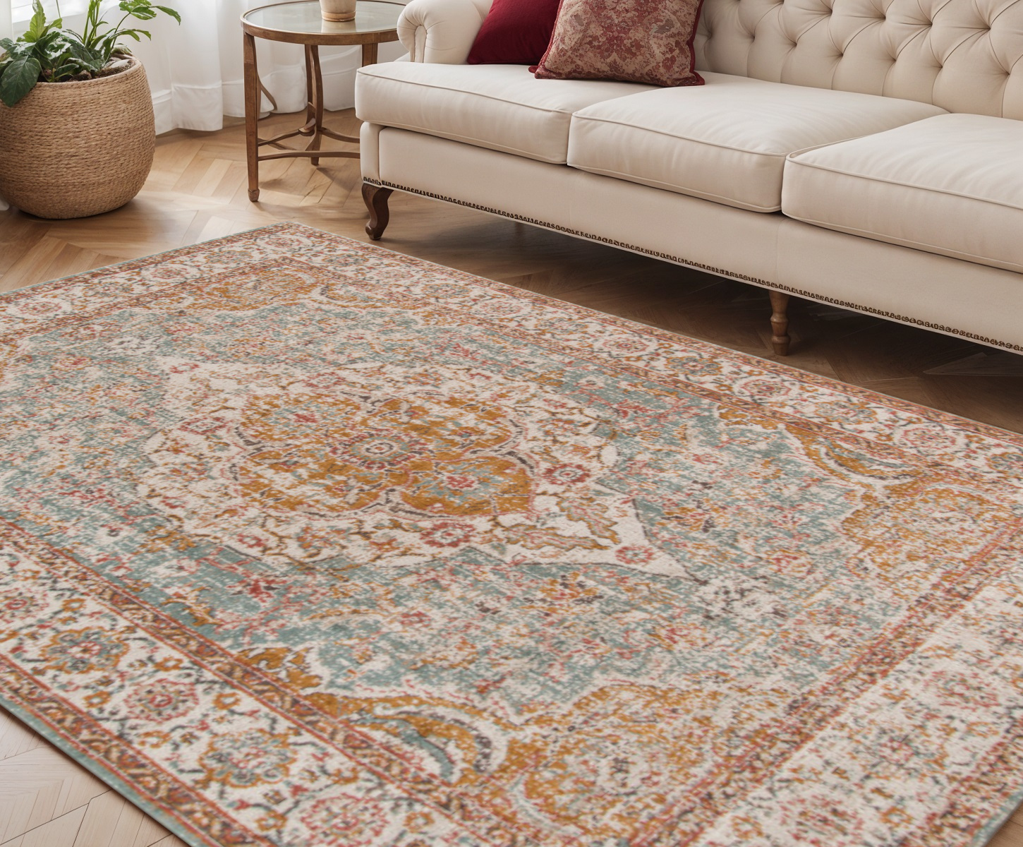 Add some artistry to your room with this 5-foot x 8-foot orange light blue and beige oriental area rug. Ideal for spaces with kids and pets, this rug is stain resistant to help repel dirt and spilled liquids. Built to last, this rug crafted from polypropylene fibers is known for its durability and long lasting appeal. Rugs are a great way to showcase your style, hide imperfections, warm your home and reduce noise. This larger sized, transitional styled rug is ready to create a focal point or statement piece in your room. 67.00-inch h x 90.00-inch w x 0.15-inch d.