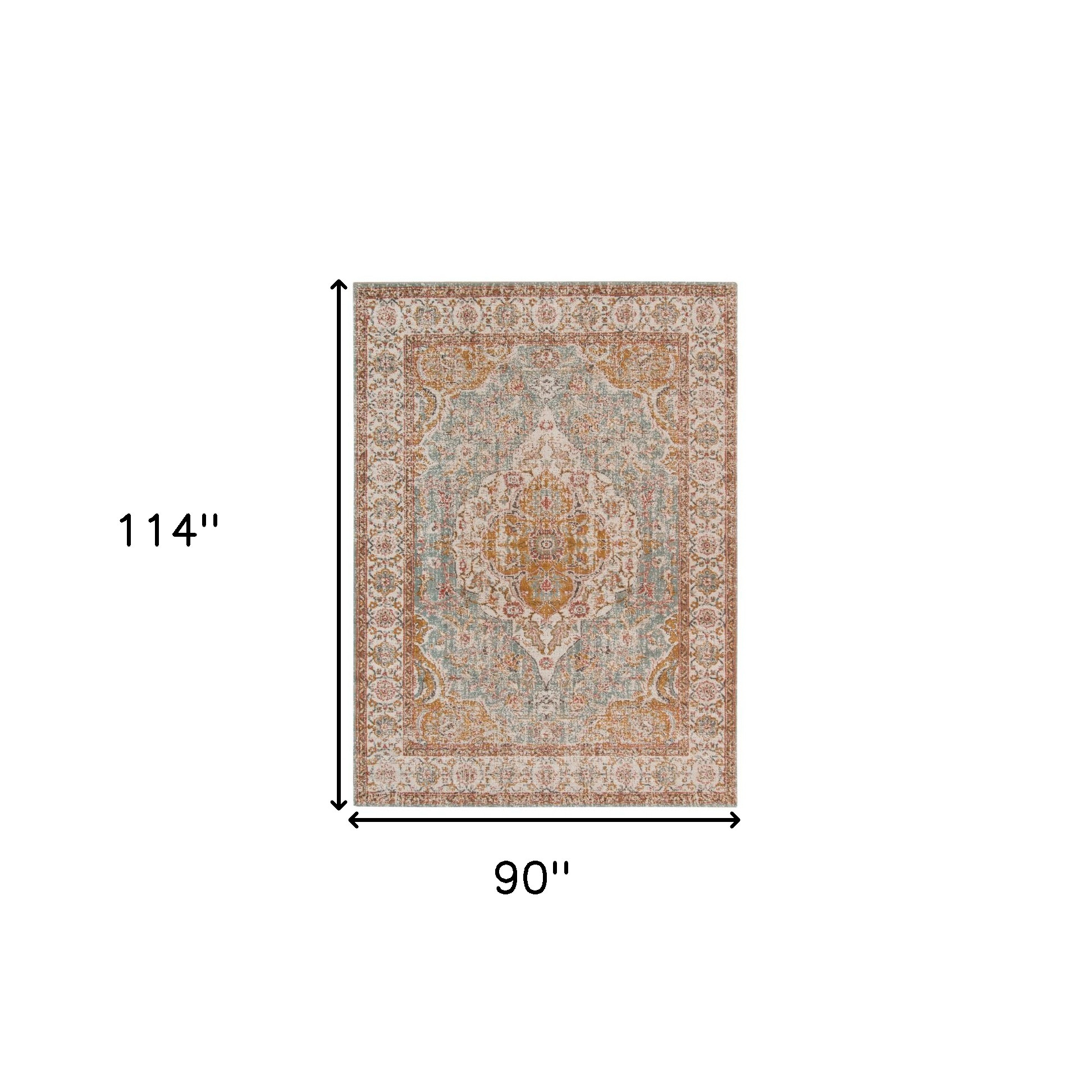 This 7-foot x 9-foot orange light blue and beige oriental distressed area rug, is a great way to add warmth to a room. Ideal for spaces with kids and pets, this rug is stain resistant to help repel dirt and spilled liquids. Built to last, this rug crafted from polypropylene fibers is known for its durability and long lasting appeal. Rugs are a great way to showcase your style, hide imperfections, warm your home and reduce noise. This larger sized, transitional styled rug is ready to create a focal point or statement piece in your room. 90.00-inch h x 114.00-inch w x 0.15-inch d.