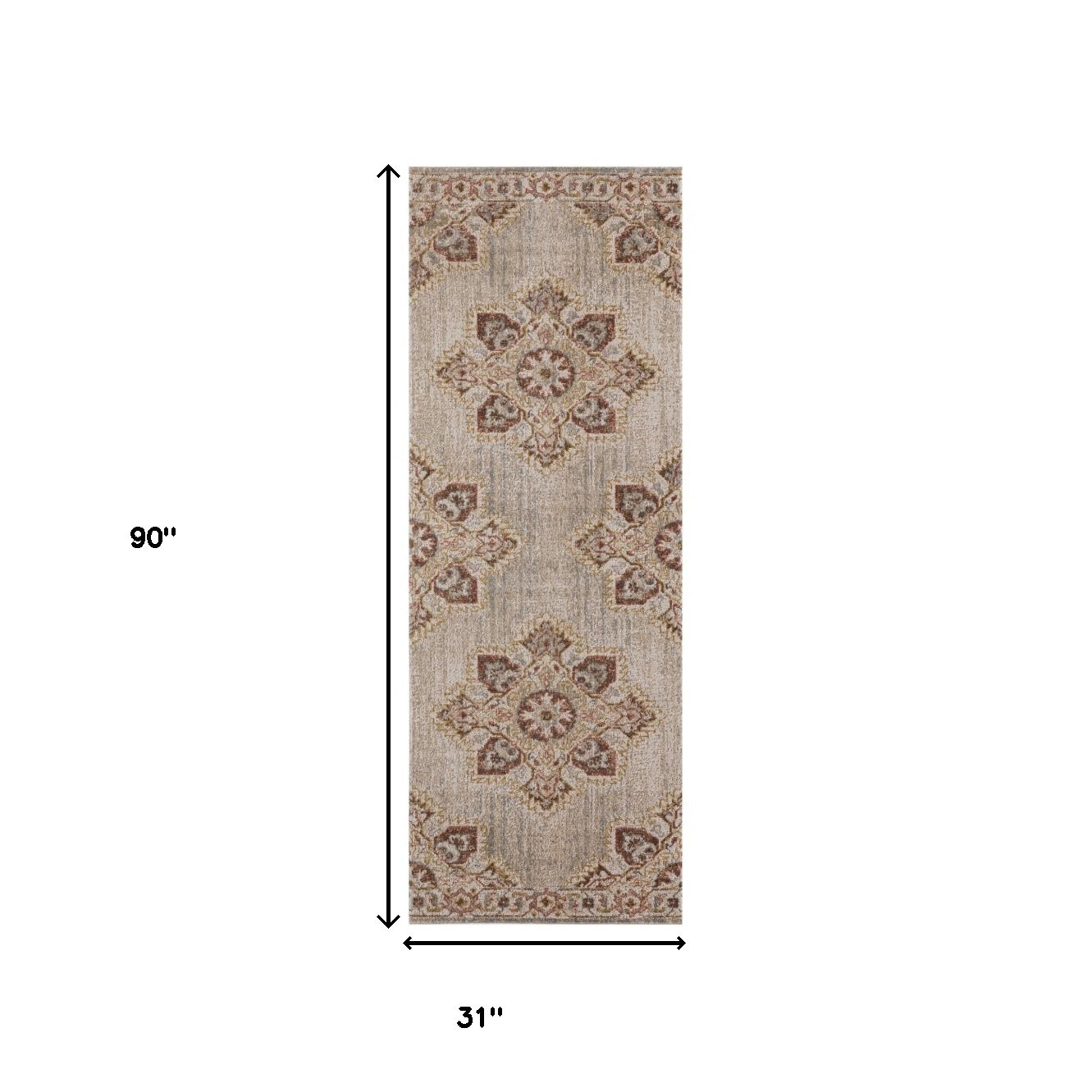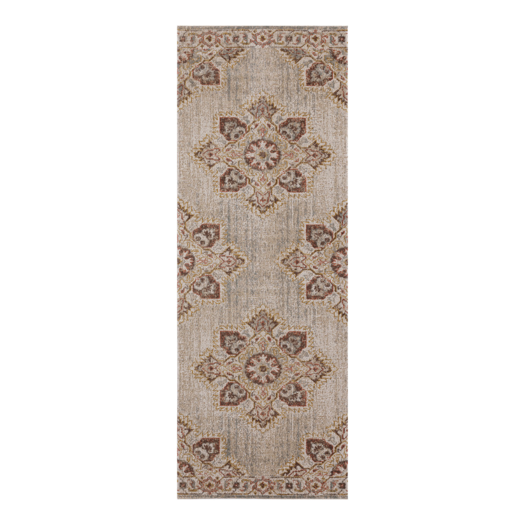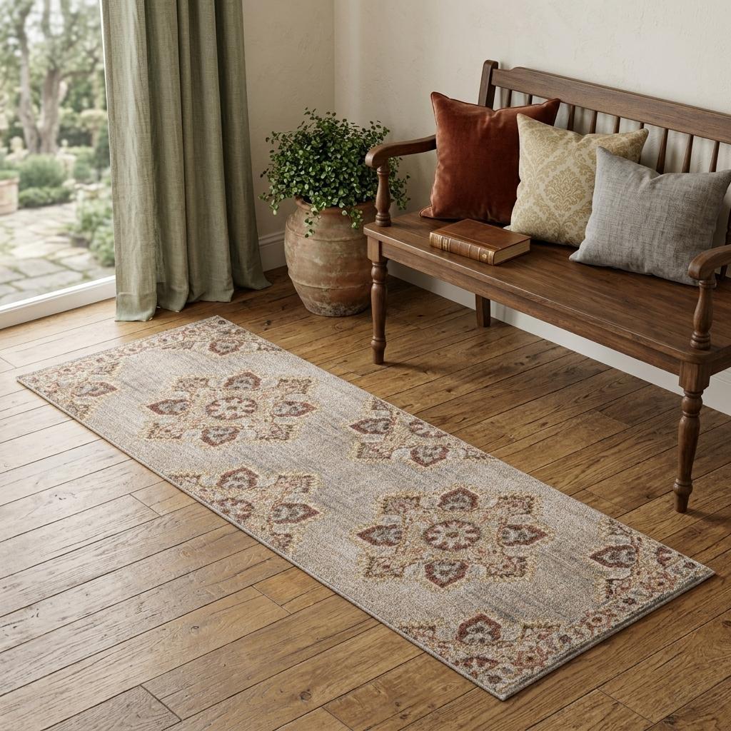 Set an inviting tone in your space with this 7-foot beige rust and teal medallion runner rug. Ideal for spaces with kids and pets, this rug is stain resistant to help repel dirt and spilled liquids. Built to last, this rug crafted from polypropylene fibers is known for its durability and long lasting appeal. Rugs are a great way to showcase your style, hide imperfections, warm your home and reduce noise. This traditional style runner makes a great accent for the hallway, in front of cabinets, in the laundry room, or any other space you need a narrow and long rug. 31.00-inch h x 90.00-inch w x 0.15-inch d.