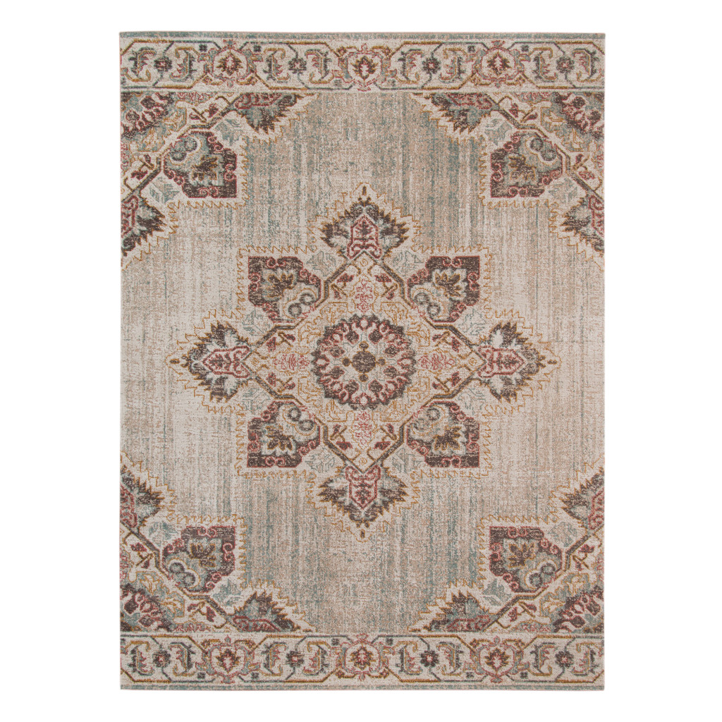Set an inviting tone in your space with this 6-foot x 8-foot beige rust and teal medallion area rug. Ideal for spaces with kids and pets, this rug is stain resistant to help repel dirt and spilled liquids. Built to last, this rug crafted from polypropylene fibers is known for its durability and long lasting appeal. Rugs are a great way to showcase your style, hide imperfections, warm your home and reduce noise. This larger sized, traditional styled rug is ready to create a focal point or statement piece in your room. 67.00-inch h x 90.00-inch w x 0.15-inch d.