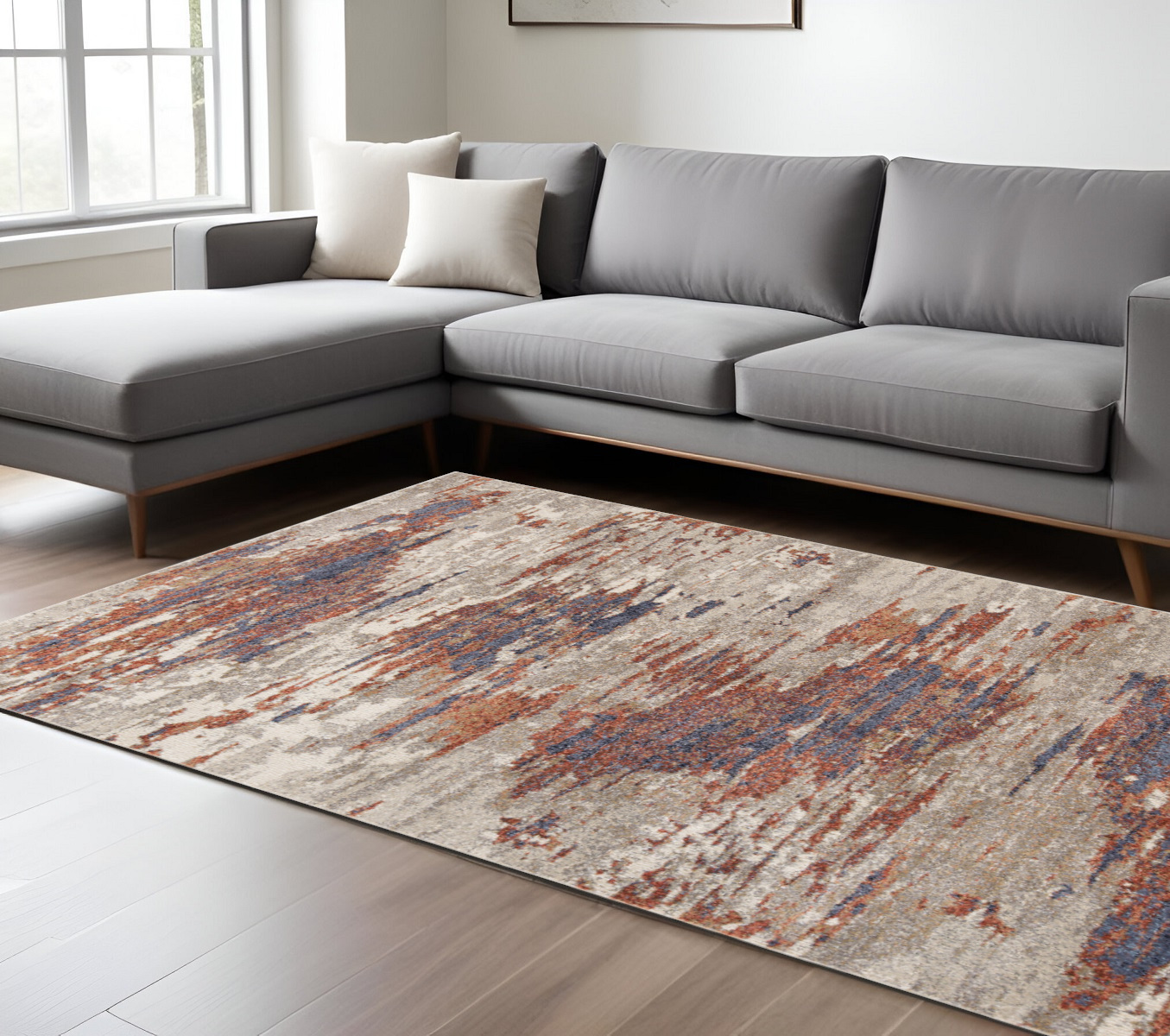 Add some artistry to your room with this 9-foot x 12-foot beige rust and blue abstract area rug. Ideal for spaces with kids and pets, this rug is stain resistant to help repel dirt and spilled liquids. Built to last, this rug crafted from polypropylene fibers is known for its durability and long lasting appeal. Rugs are a great way to showcase your style, hide imperfections, warm your home and reduce noise. This larger sized, contemporary styled rug is ready to create a focal point or statement piece in your room. 110-inch h x 146-inch w x 0.4-inch d.