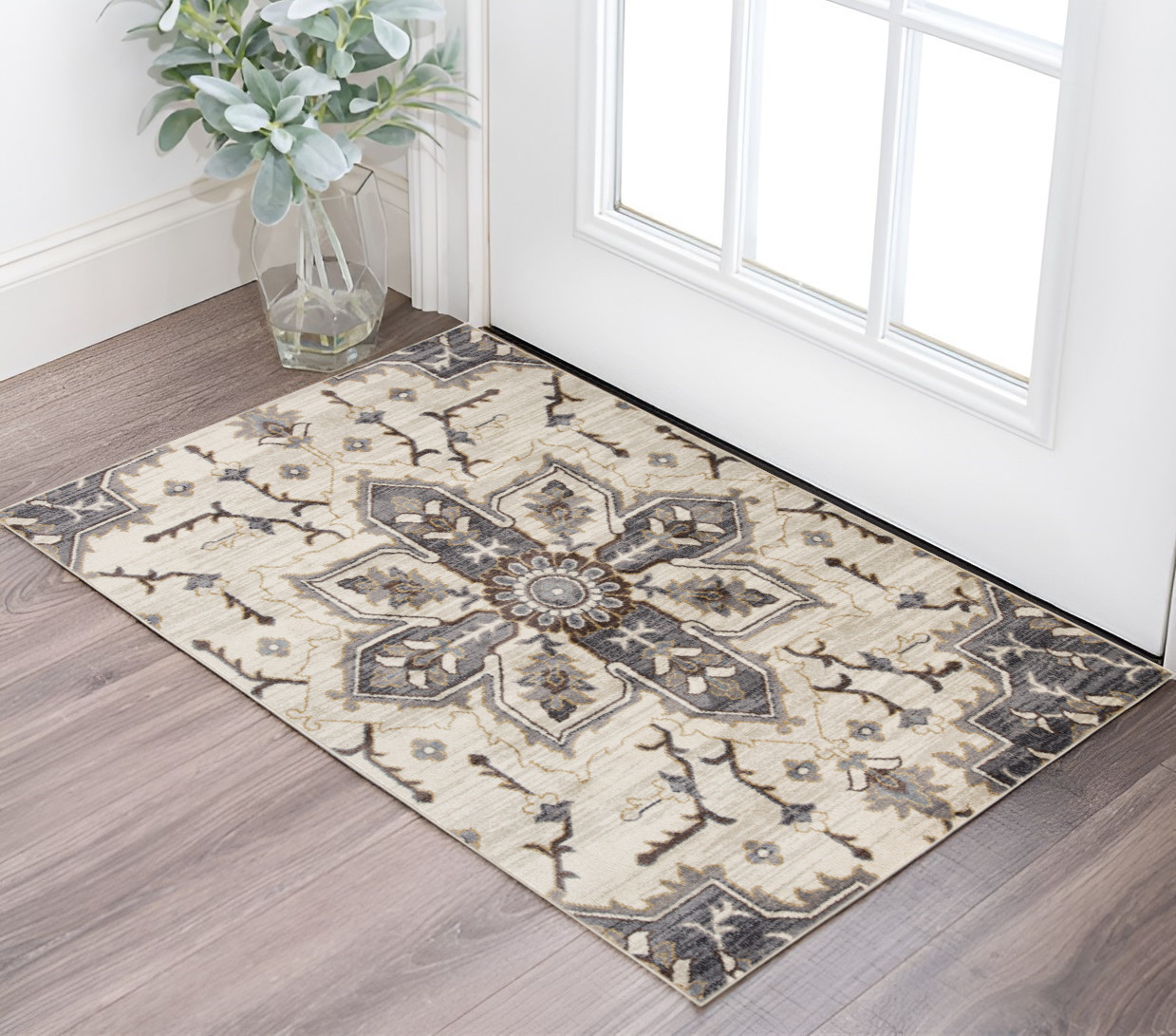 This 2-foot x 3-foot ivory gray and brown floral medallion area rug, is a great way to add warmth to a room. Ideal for spaces with kids and pets, this rug is stain resistant to help repel dirt and spilled liquids. Built to last, this rug crafted from polypropylene fibers is known for its durability and long lasting appeal. Rugs are a great way to showcase your style, hide imperfections, warm your home and reduce noise. This smaller sized, traditional styled rug is just what you need for your walkway, bedside, in front of door, cabinet, refrigerator, or chair. 22.00-inch h x 35.00-inch w x 0.40-inch d.