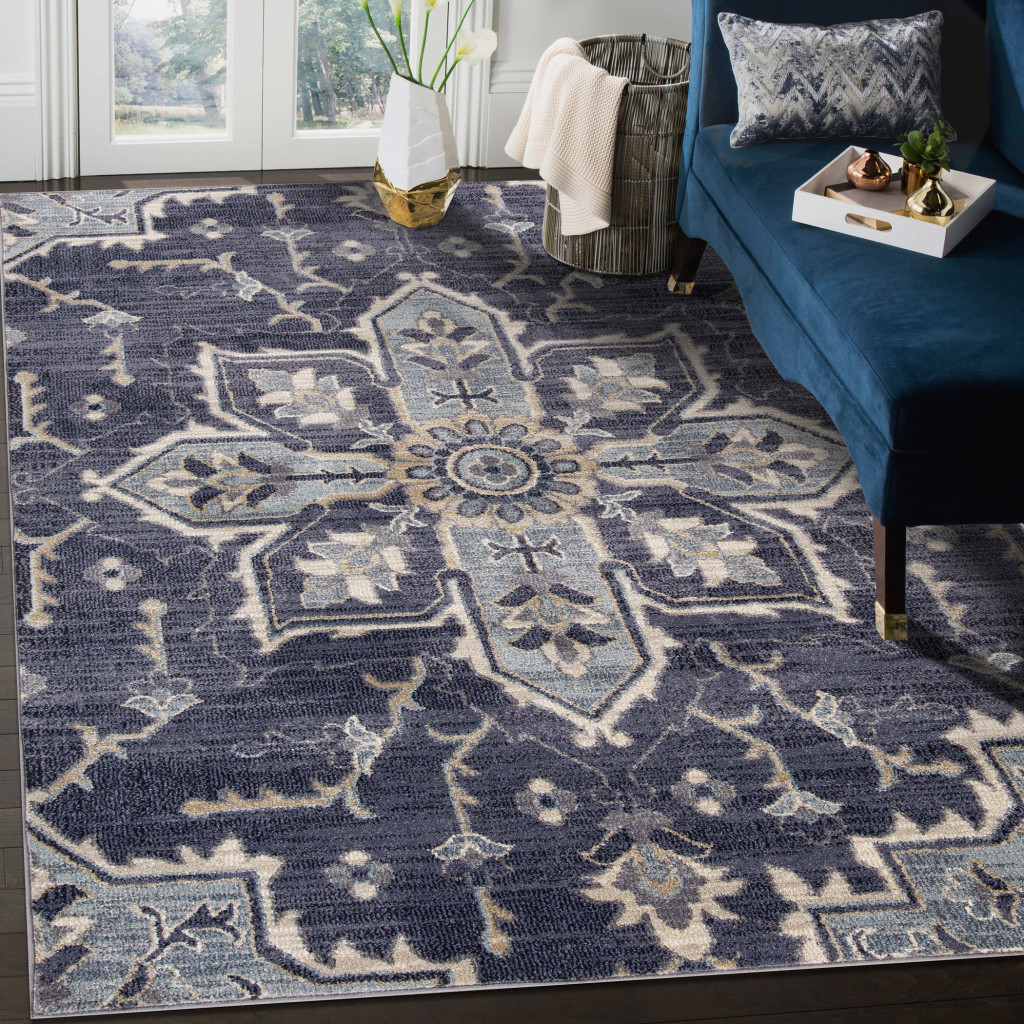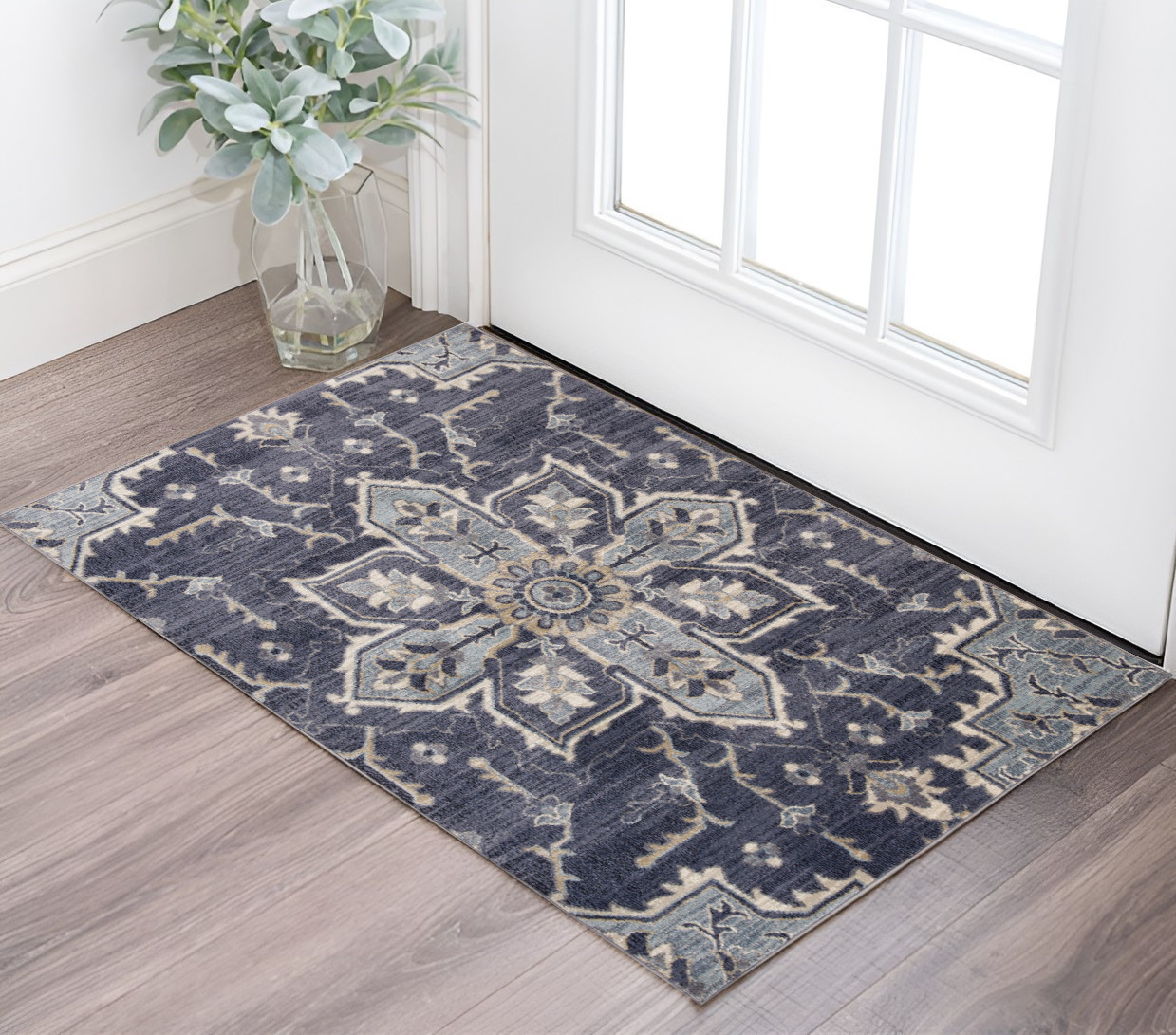Set an inviting tone in your space with this 2-foot x 3-foot ivory gray and blue floral medallion area rug. Ideal for spaces with kids and pets, this rug is stain resistant to help repel dirt and spilled liquids. Built to last, this rug crafted from polypropylene fibers is known for its durability and long lasting appeal. Rugs are a great way to showcase your style, hide imperfections, warm your home and reduce noise. This smaller sized, traditional styled rug is just what you need for your walkway, bedside, in front of door, cabinet, refrigerator, or chair. 22.00-inch h x 35.00-inch w x 0.40-inch d.