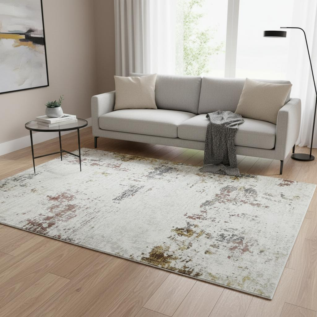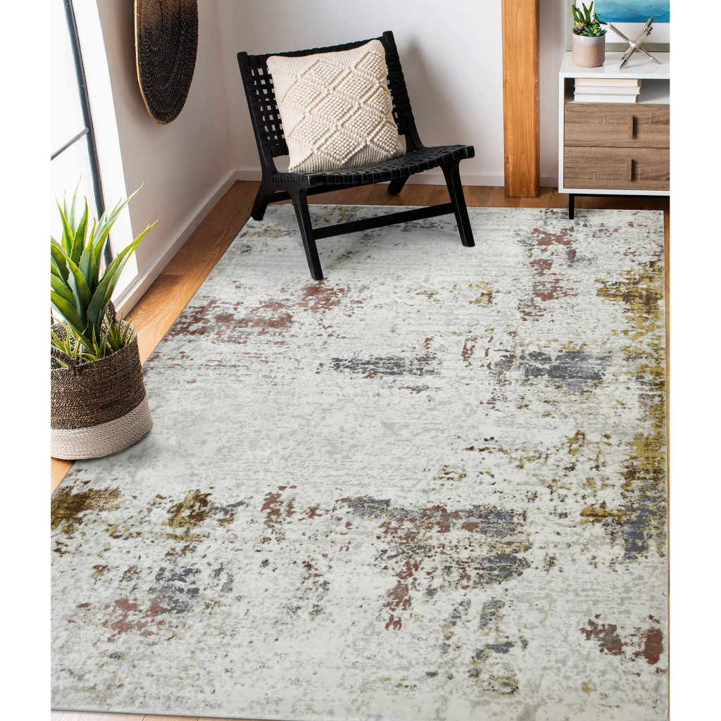 Add some artistry to your room with this 5-foot x 8-foot ivory red and gold abstract area rug. Built to last, this rug crafted from polypropylene and polyester fibers is known for its durability and long lasting appeal. Rugs are a great way to showcase your style, hide imperfections, warm your home and reduce noise. This larger sized, modern styled rug is ready to create a focal point or statement piece in your room. 63-inch h x 93-inch w x 0.39-inch d.