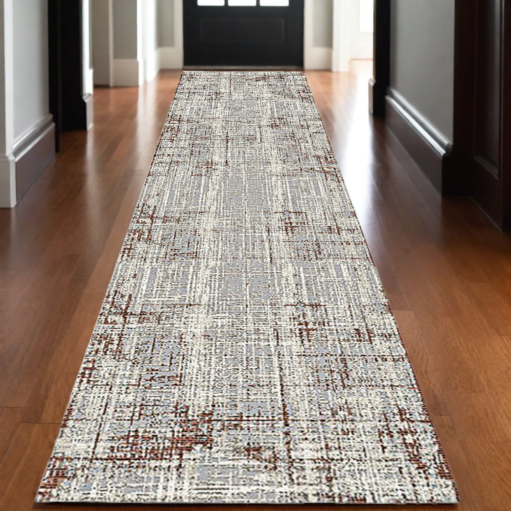 This 10-foot ivory red and gray abstract runner rug, is a great way to add warmth to a room. Built to last, this rug crafted from polypropylene and polyester fibers is known for its durability and long lasting appeal. Rugs are a great way to showcase your style, hide imperfections, warm your home and reduce noise. This rectangular shaped rug features a abstract design that will add a functional and decorative accent to your space. This modern style runner makes a great accent for the hallway, in front of cabinets, in the laundry room, or any other space you need a narrow and long rug. 32-inch h x 120-inch w x 0.39-inch d.