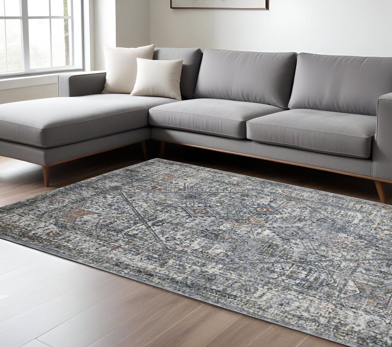 Set an inviting tone in your space with this 8-foot x 10-foot ivory gray and rust oriental area rug. Built to last, this rug crafted from polyester fibers is known for its durability and long lasting appeal. Rugs are a great way to showcase your style, hide imperfections, warm your home and reduce noise. This larger sized, contemporary styled rug is ready to create a focal point or statement piece in your room. 94.00-inch h x 118.00-inch w x 0.38-inch d.