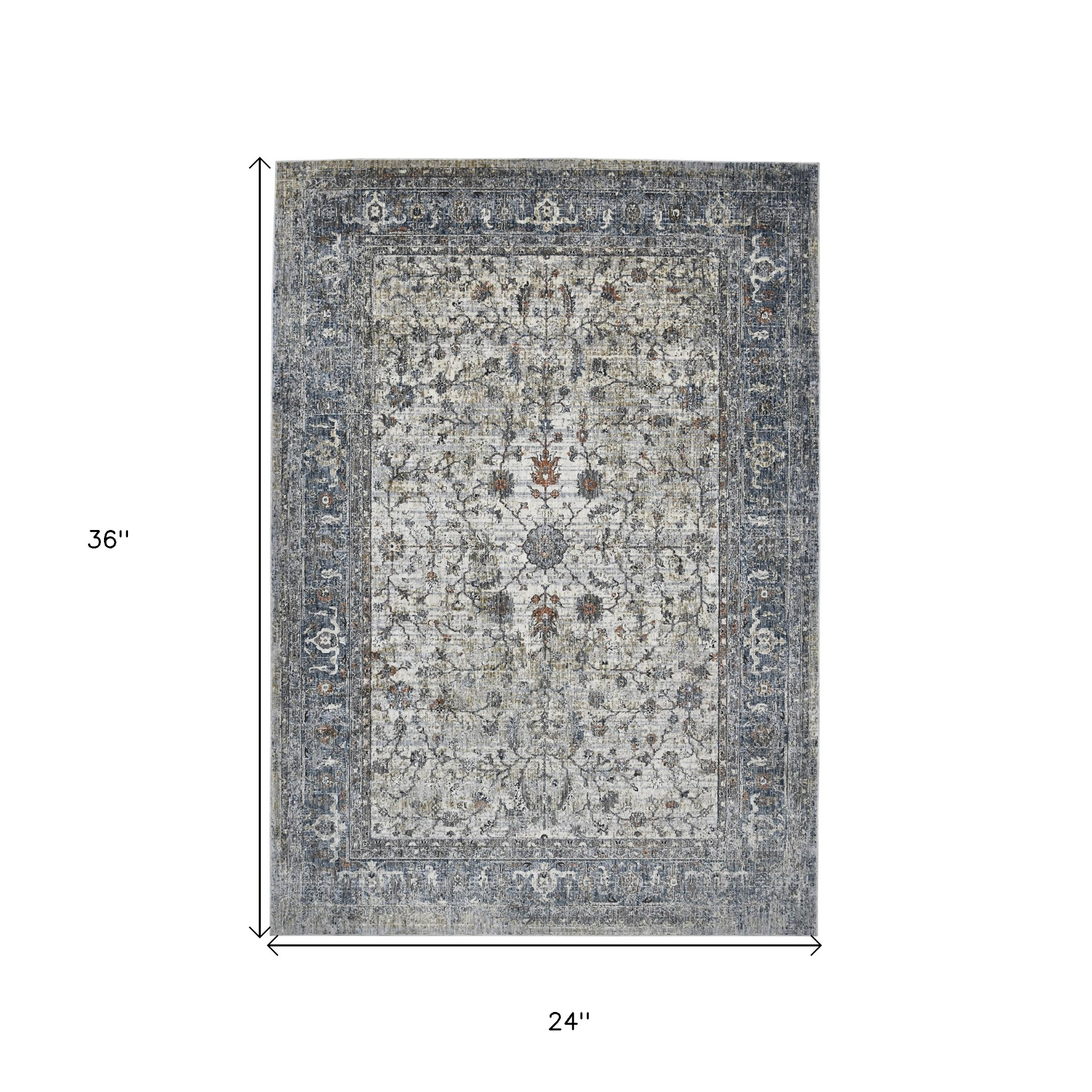 Set an inviting tone in your space with this 2-foot x 3-foot ivory blue and gray oriental area rug. Built to last, this rug crafted from polyester fibers is known for its durability and long lasting appeal. Rugs are a great way to showcase your style, hide imperfections, warm your home and reduce noise. This smaller sized, contemporary styled rug is just what you need for your walkway, bedside, in front of door, cabinet, refrigerator, or chair. 24-inch h x 36-inch w x 0.38-inch d.