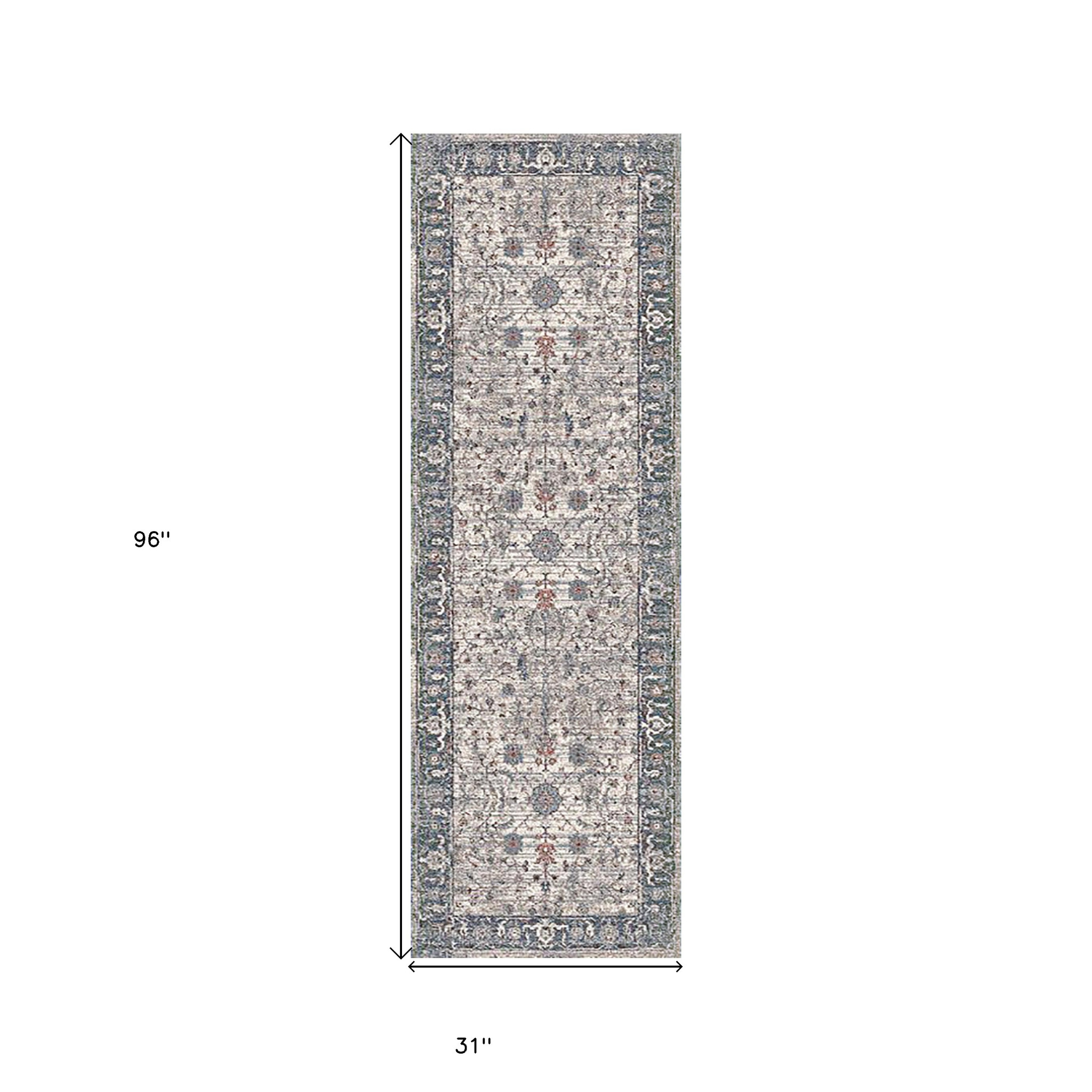 Add some artistry to your room with this 8-foot ivory blue and gray oriental runner rug. Built to last, this rug crafted from polyester fibers is known for its durability and long lasting appeal. Rugs are a great way to showcase your style, hide imperfections, warm your home and reduce noise. This rectangular shaped rug features a abstract design that will add a functional and decorative accent to your space. This contemporary style runner makes a great accent for the hallway, in front of cabinets, in the laundry room, or any other space you need a narrow and long rug. 31-inch h x 96-inch w x 0.38-inch d.