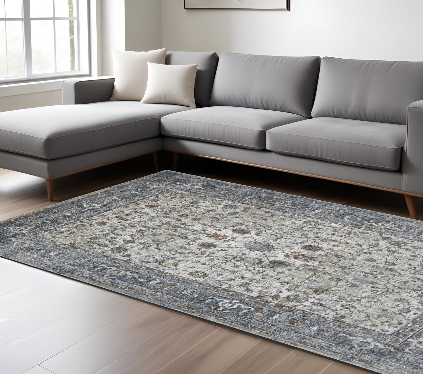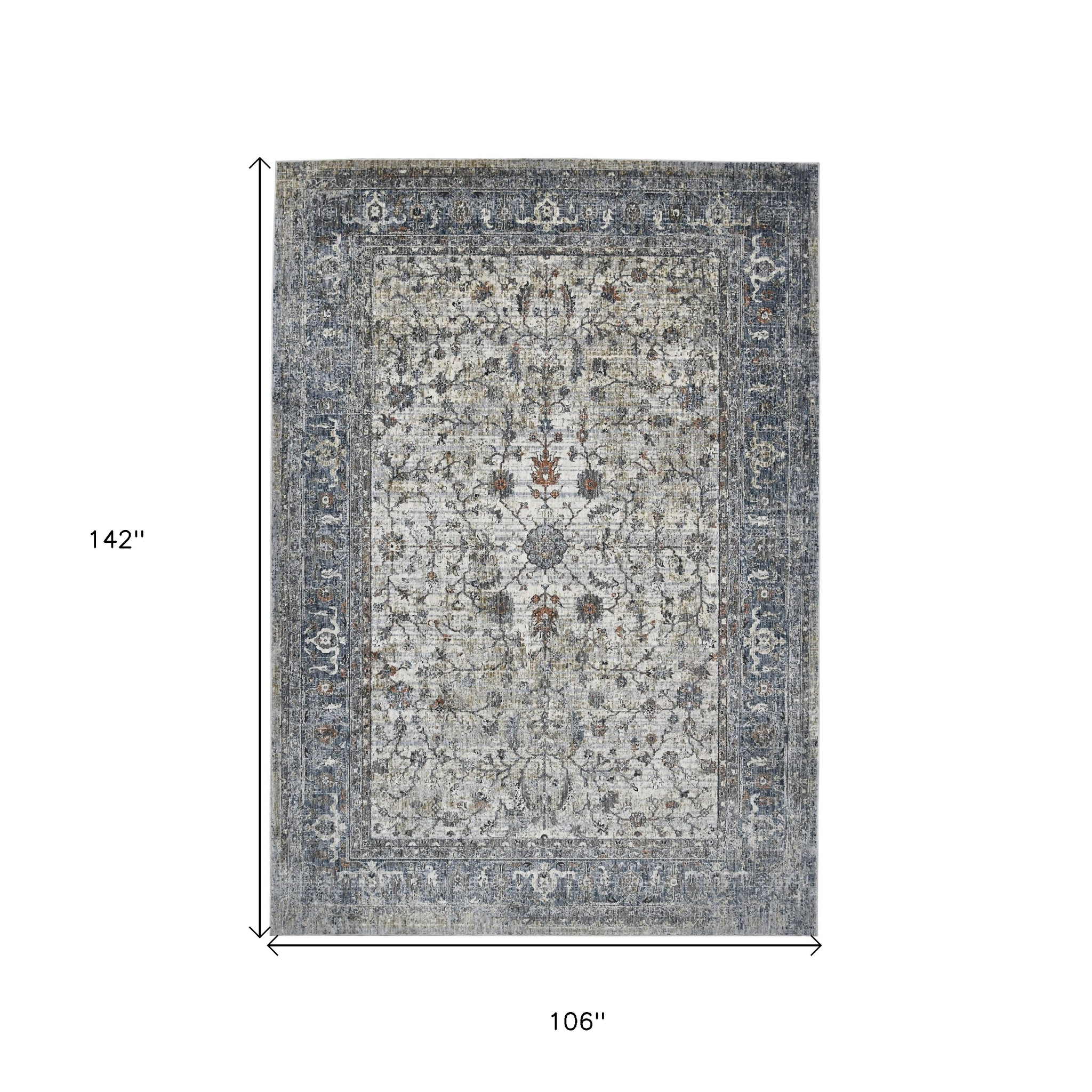 This 9-foot x 12-foot ivory blue and gray oriental area rug, is a great way to add warmth to a room. Built to last, this rug crafted from polyester fibers is known for its durability and long lasting appeal. Rugs are a great way to showcase your style, hide imperfections, warm your home and reduce noise. This larger sized, contemporary styled rug is ready to create a focal point or statement piece in your room. 106.00-inch h x 142.00-inch w x 0.38-inch d.