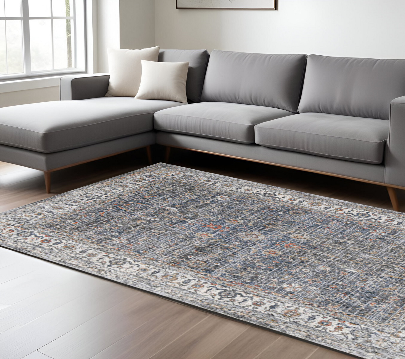 Add great coloration and comfortable texture to your space with this 9-foot x 12-foot ivory charcoal and brick red oriental area rug. Built to last, this rug crafted from polyester fibers is known for its durability and long lasting appeal. Rugs are a great way to showcase your style, hide imperfections, warm your home and reduce noise. This larger sized, contemporary styled rug is ready to create a focal point or statement piece in your room. 106.00-inch h x 142.00-inch w x 0.38-inch d.