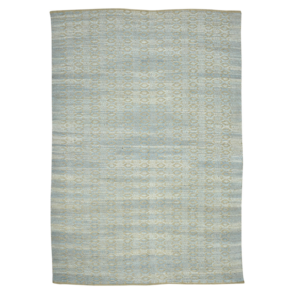 This 8-foot x 10-foot light blue and tan jute geometric flatweave handmade area rug, is a great way to add warmth to a room. Crafted from jute fibers that give this piece premium texture, refinement, and appeal. Rugs are a great way to showcase your style, hide imperfections, warm your home and reduce noise. This larger sized, casual styled rug is ready to create a focal point or statement piece in your room. 96-inch h x 120-inch w x 0.2-inch d.
