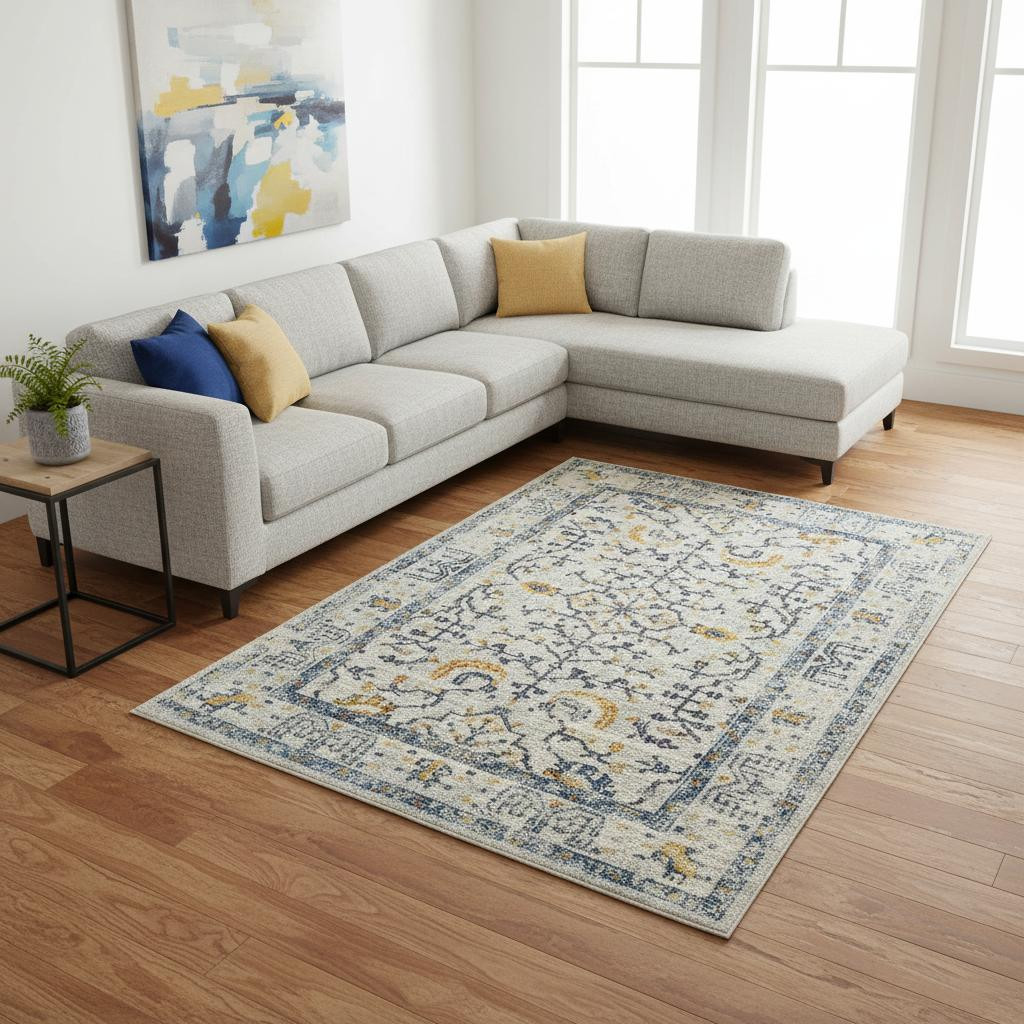 Set an inviting tone in your space with this 9-foot x 12-foot ivory and yellow oriental distressed area rug. Ideal for spaces with kids and pets, this rug is stain resistant to help repel dirt and spilled liquids. Built to last, this rug crafted from polypropylene fibers is known for its durability and long lasting appeal. Rugs are a great way to showcase your style, hide imperfections, warm your home and reduce noise. This larger sized, transitional styled rug is ready to create a focal point or statement piece in your room. 106.00-inch h x 142.00-inch w x 0.38-inch d.