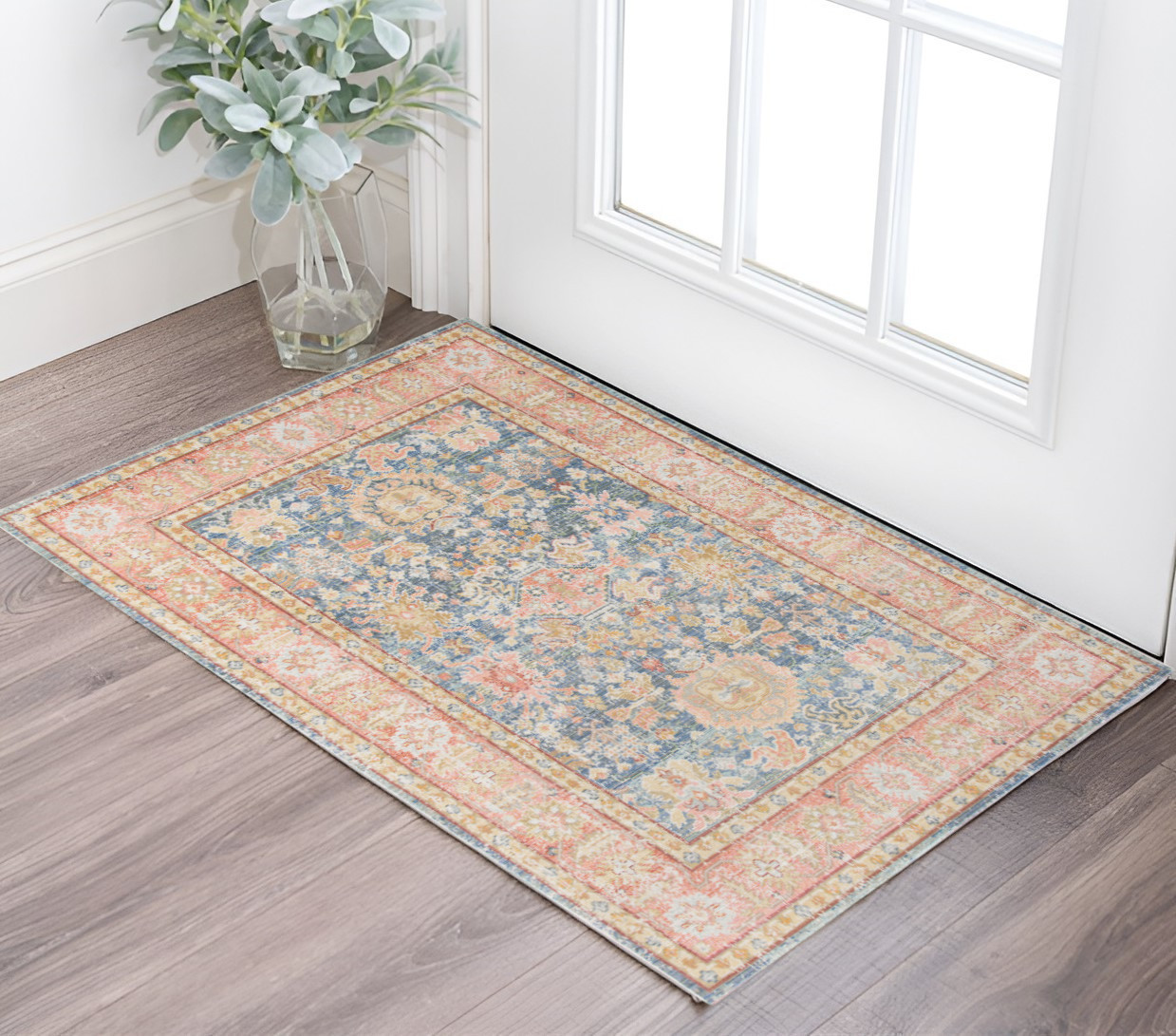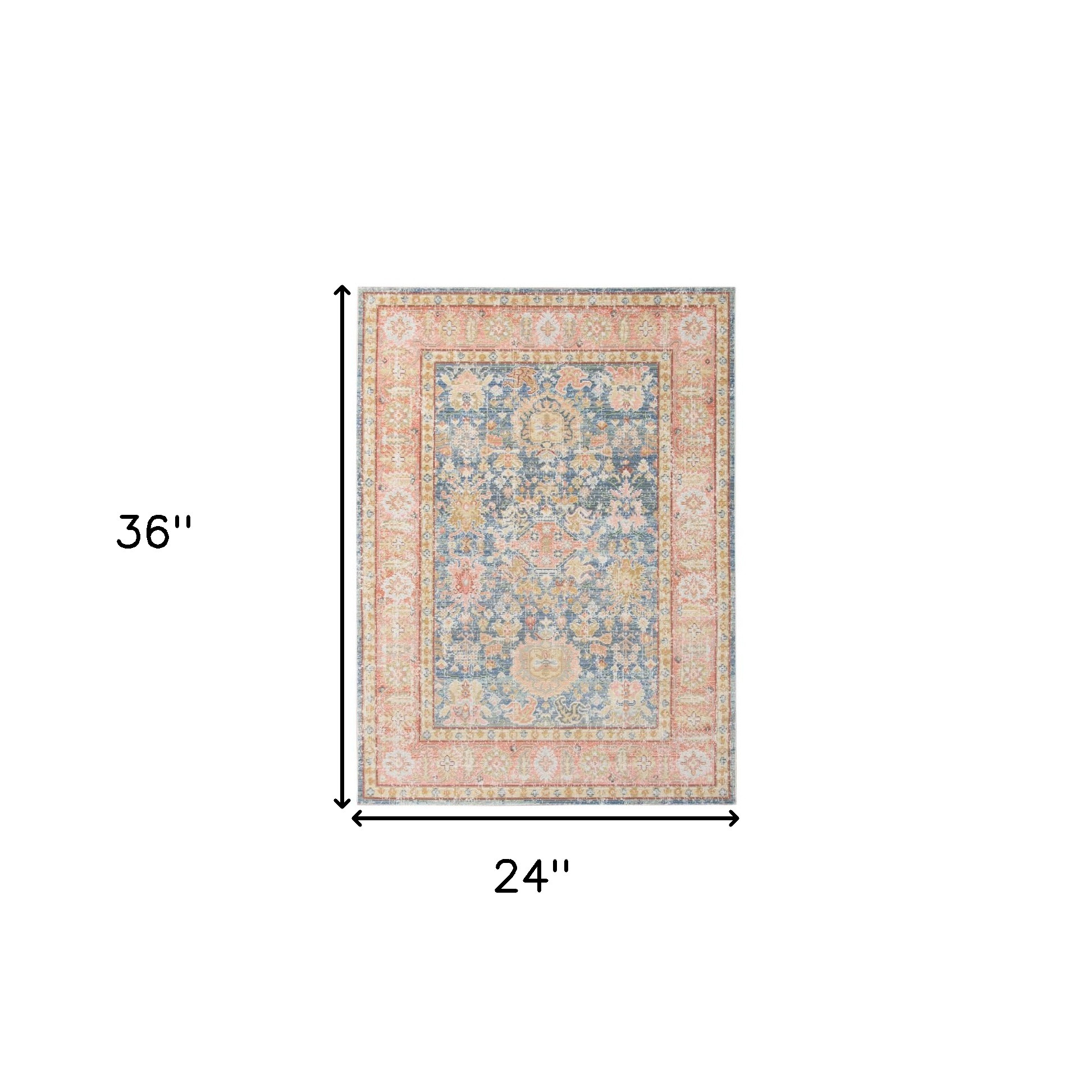2' X 3' Coral And Blue Oriental Distressed Area Rug